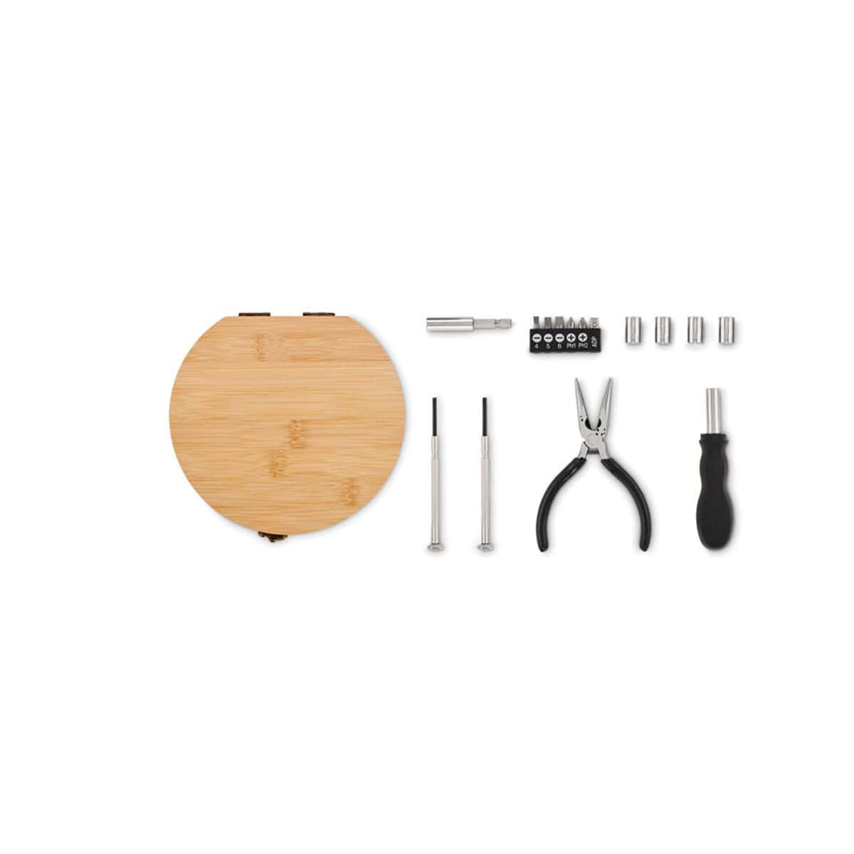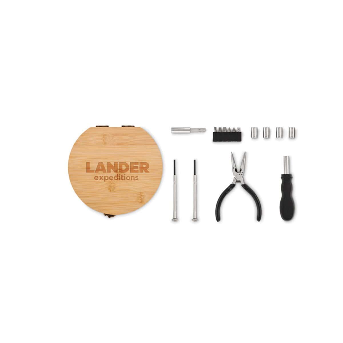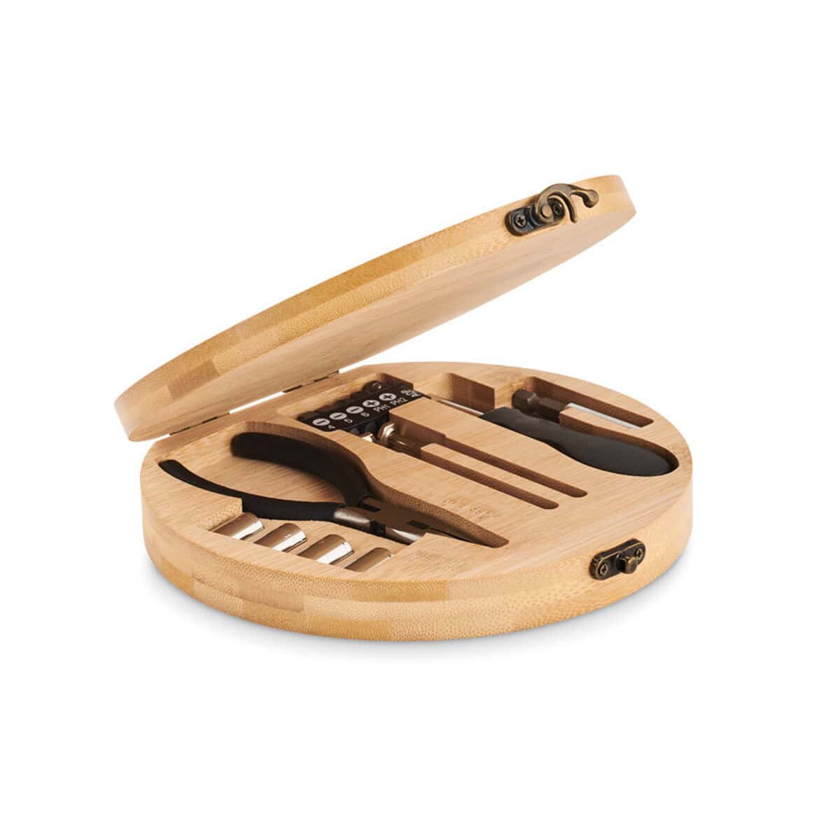Drewno bambusowe nadaje całości unikalny wzór, a każda sztuka może nieznacznie różnić się kolorem, dzięki czemu Twój 15-elementowy zestaw narzędzi BARTLETT będzie jedyny w swoim rodzaju. Naturalny materiał sprawia, że produkt jest przyjazny środowisku, co czyni go doskonałym wyborem dla marek promujących zrównoważony rozwój.