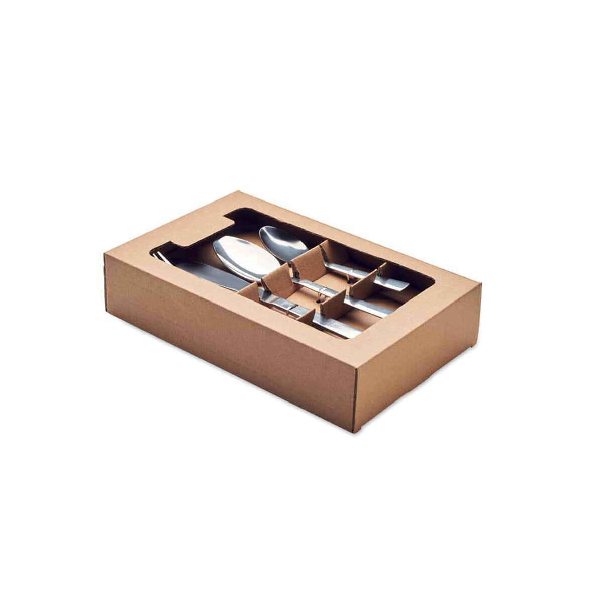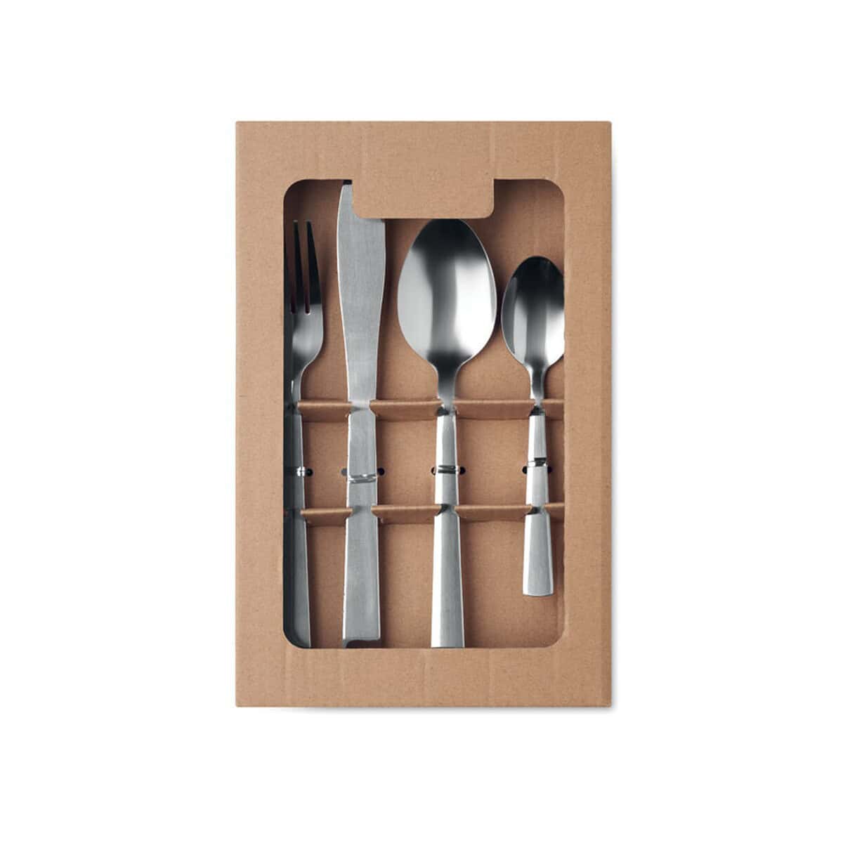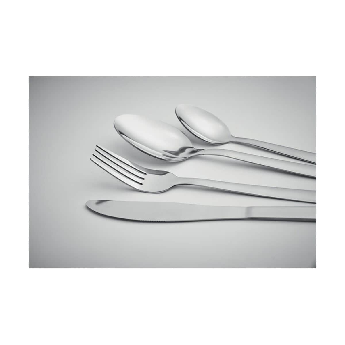 W skład kompletu wchodzi 16 elementów – 4 łyżeczki do herbaty, 4 łyżki stołowe, 4 widelce oraz 4 noże. Wykonano je z trwałej stainless steel, co gwarantuje odporność na korozję, łatwe czyszczenie i długowieczność. Zestaw ma kompaktowe wymiary 16 × 5 × 25 cm oraz wagę jedynie 0,675 kg, dzięki czemu bez trudu zmieści się w szufladzie, plecaku piknikowym czy firmowym bufecie. Całość zapakowano w elegancki kartonik, przygotowany pod wyraźny nadruk reklamowy, który zaakcentuje każdą markę.