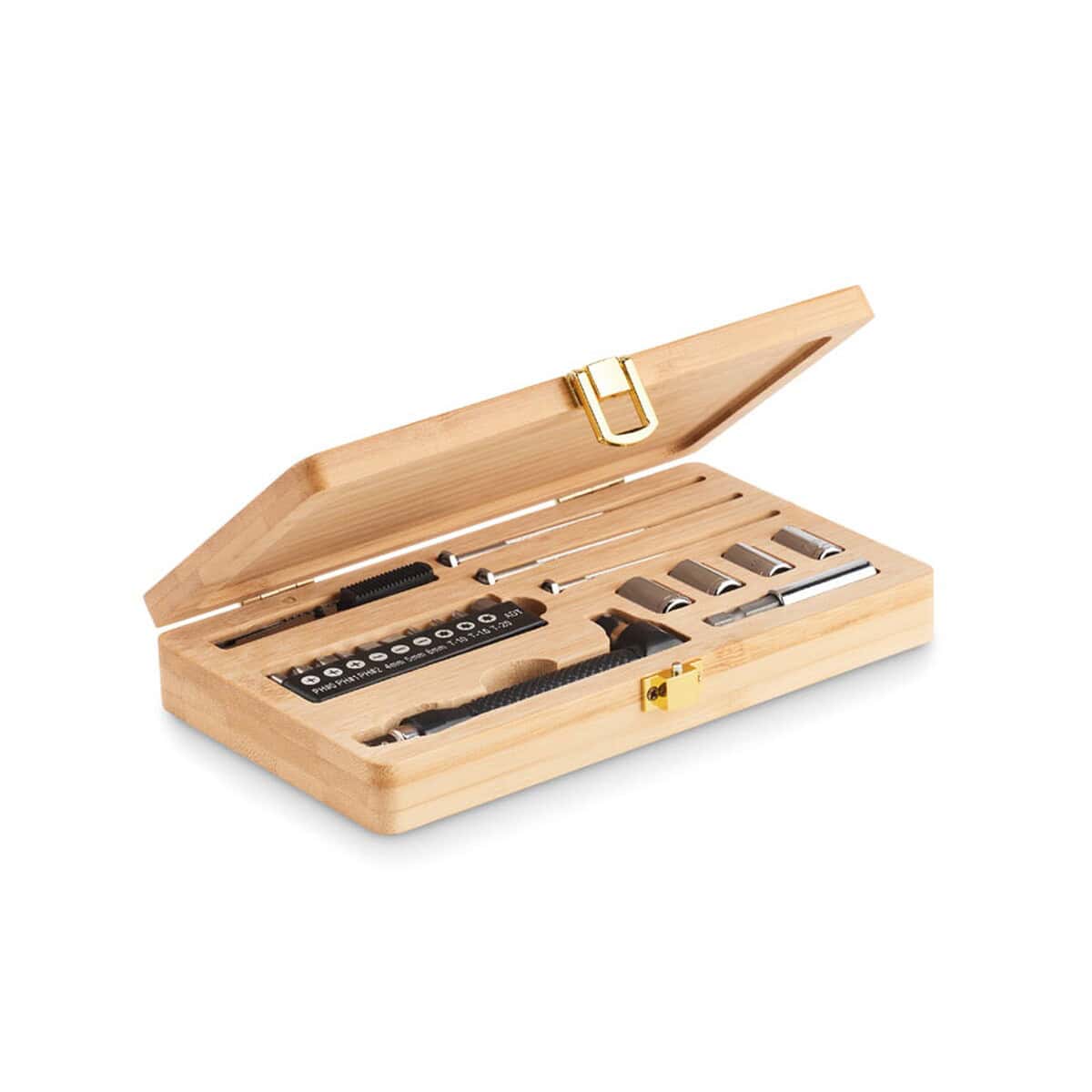 21-częściowy zestaw narzędzi GALLAWAY to prawdziwy majstersztyk wśród upominków reklamowych 😊. Zamknięty w eleganckiej, wykonanej z naturalnego bambusu walizce, stanowi wyśmienitą wizytówkę dla Twojej firmy. Solidne wykończenie i wyraźne miejsce na logo lub precyzyjny nadruk pozwalają zamienić funkcjonalny produkt w efektowny gadżet, który podkreśli charakter każdej marki, od branży budowlanej i instalatorskiej, po firmy szkoleniowe, motoryzacyjne czy technologiczne.
