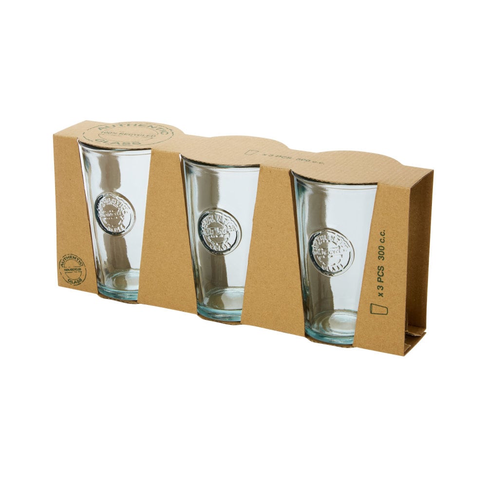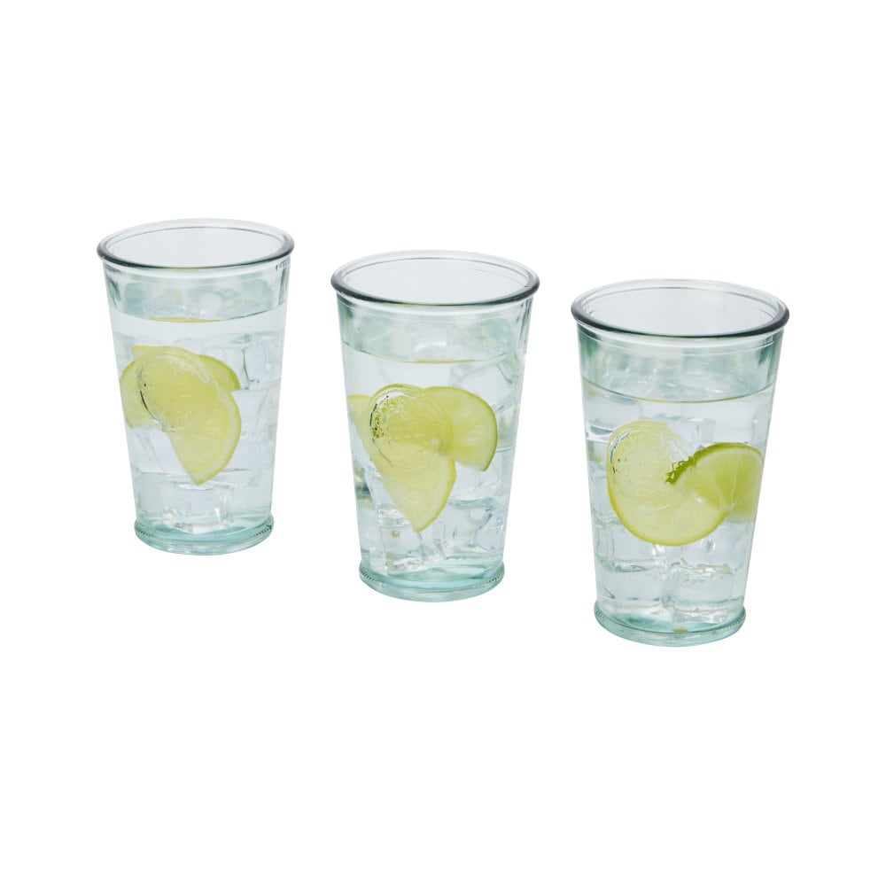 Ten 3-częściowy zestaw szkła z recyklingu to idealny dodatek do każdego domu. Wykonany z 1 szklanej butelki, zawiera trzy kubki o pojemności 300 ml. Ten zestaw z recyklingu jest wyjątkowy, ponieważ szkło wykonane jest przy mniejszym zużyciu energii, surowców i dodatków, niż jest to wymagane do produkcji tradycyjnego szkła. Każdy kubek ma wymiary 13 cm wysokości i 8 cm średnicy. Ten zestaw szkła z recyklingu to świetny wybór dla osób, które cenią sobie zarówno estetyczny wygląd, jak i przyjazny dla środowiska produkt.