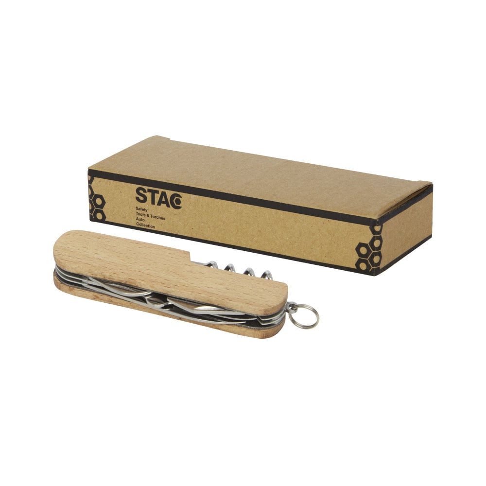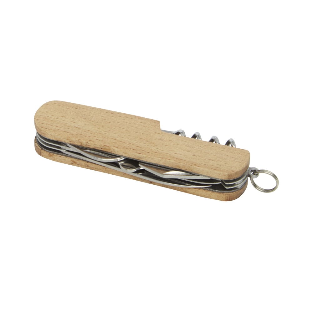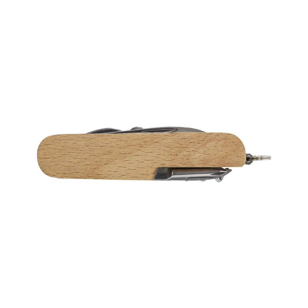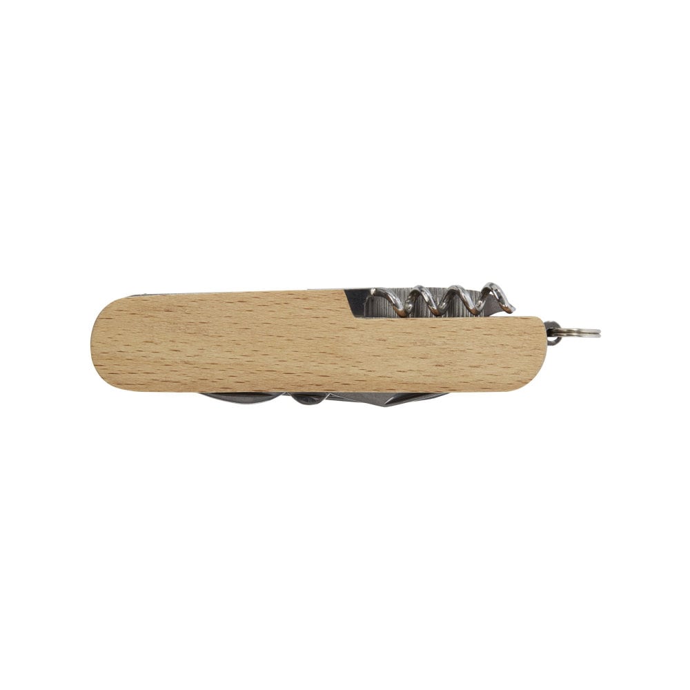 Ten wytrzymały kompaktowy scyzoryk wykonany jest z wysokiej jakości stali nierdzewnej, a rękojeści z drewna bukowego pochodzącego ze zrównoważonych i ekologicznych źródeł. Zawiera 7 praktycznych funkcji w tym nóż, korkociąg, pilnik/czyścik do pilników, brelok do kluczy, płaski śrubokręt, otwieracz do butelek/kanistrów i nożyczki. Jest to niezbędne narzędzie dla każdego harcerza, majsterkowicza czy miłośnika outdooru. Po otwarciu scyzoryk ma wymiary 17 x 2,5 cm, a po zamknięciu 9,5 x 2,5 cm. Dostarczany jest z instrukcją obsługi i zapakowany w stylowe, recyklingowe pudełko prezentowe o wymiarach 12 x 4,5 x 2 cm. Dodatkowo, jako opcja trwałej dekoracji, produkt można zgrawerować.