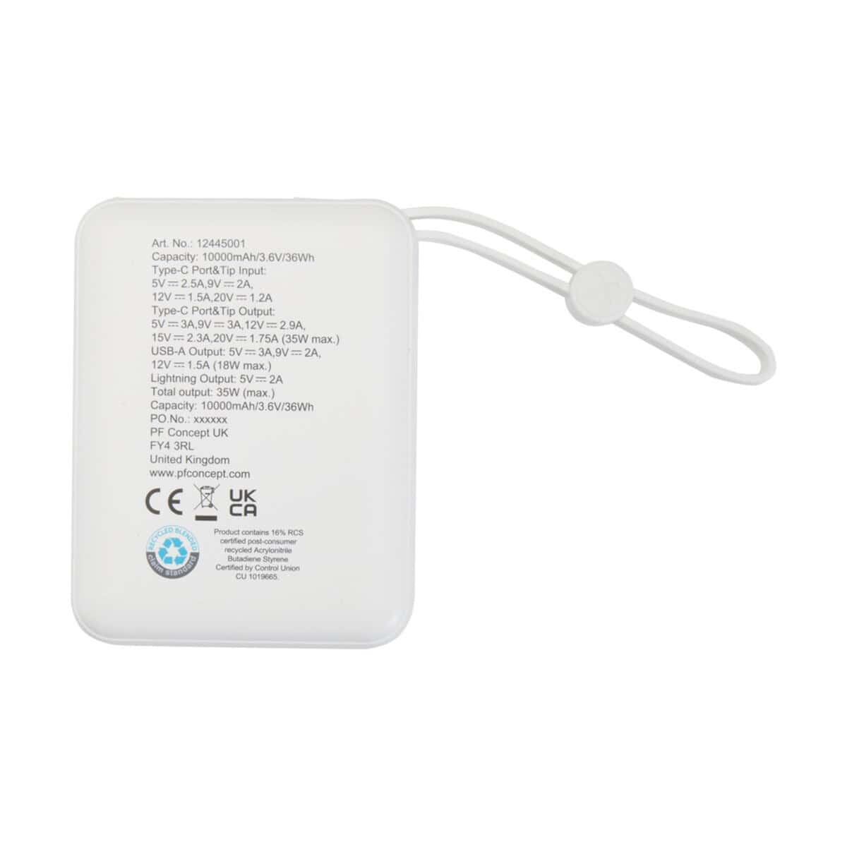 Acrux powerbank do tabletu o pojemności 10 000 mAh i mocy 35 W z wbudowanym kablem typu C – wykonany z tworzyw sztucznych pochodzących z recyklingu będzie perfekcyjnym prezentem dla kadry menedżerskiej, handlowców podróżujących między spotkaniami, jak i studentów, którzy cenią niezawodność. Jako reklamowy upominek z nadrukiem firmowym wyróżni Twoją markę spośród konkurencji, wzmacniając świadomość brandu w każdej sytuacji, gdy użytkownicy sięgną po zastrzyk energii.