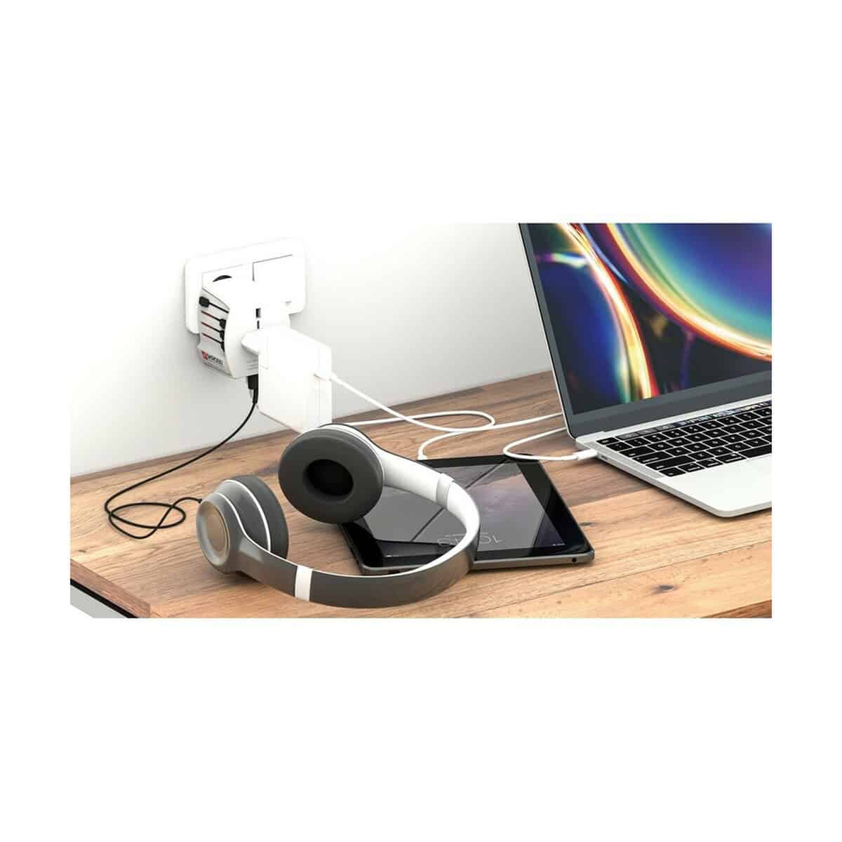 Uniwersalna ładowarka z dwoma wyjściami USB i USB-C pozwala jednocześnie zasilić smartfon, tablet, słuchawki czy powerbank. Kompaktowy rozmiar oraz kolor biały sprawiają, że urządzenie prezentuje się elegancko w każdych warunkach, a wysokogatunkowy materiał PC zwiększa odporność na uderzenia. Nieważne, czy odwiedzasz Tokio, Nowy Jork czy Sydney – jeden adapter wystarczy, by bez stresu ładować cały sprzęt.