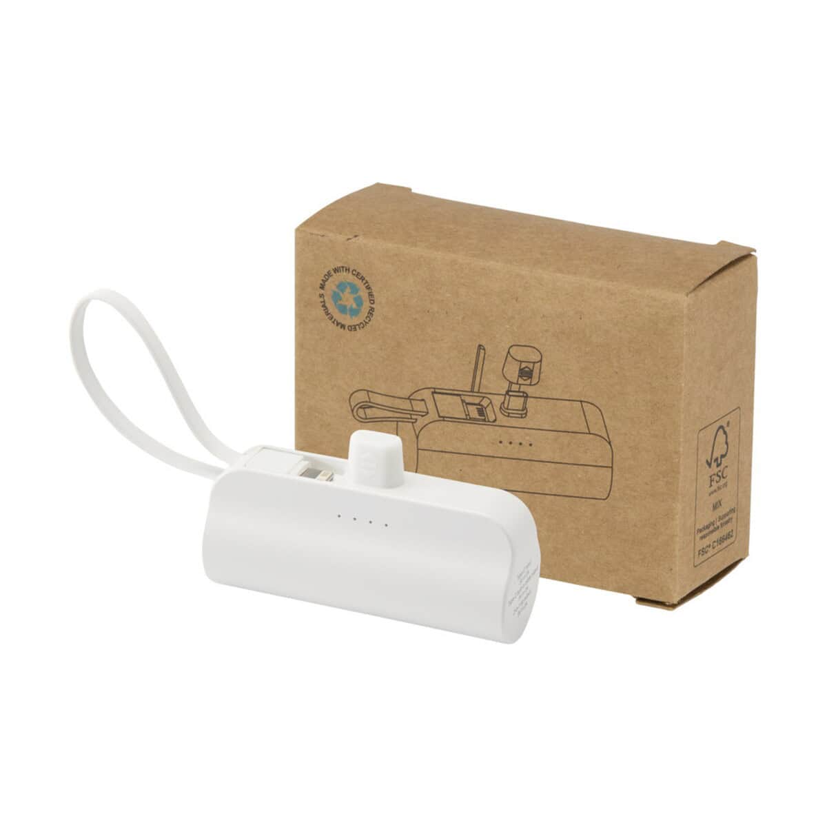 Alnair powerbank o pojemności 5000 mAh i mocy 10 W, wykonany z tworzyw sztucznych pochodzących z recyklingu, z wbudowaną podstawką i kablem 2 w 1 sprawdzi się w rękach aktywnych profesjonalistów, studentów, podróżników i graczy mobilnych. Znakomicie wesprze kampanie promocyjne firm kurierskich, linii lotniczych czy biur podróży, podkreślając hasło „energię mamy zawsze przy sobie”. Może być również częścią pakietu powitalnego dla nowych pracowników, zapewniając im mobilność od pierwszego dnia. Dostępność w dwóch klasycznych kolorach – białym i czarnym – ułatwia dopasowanie do identyfikacji wizualnej. Ten kompaktowy, ekologiczny i funkcjonalny powerbank to doskonały sposób na wzmocnienie wizerunku i dostarczenie realnej wartości użytkownikom dla Twojej firmy.