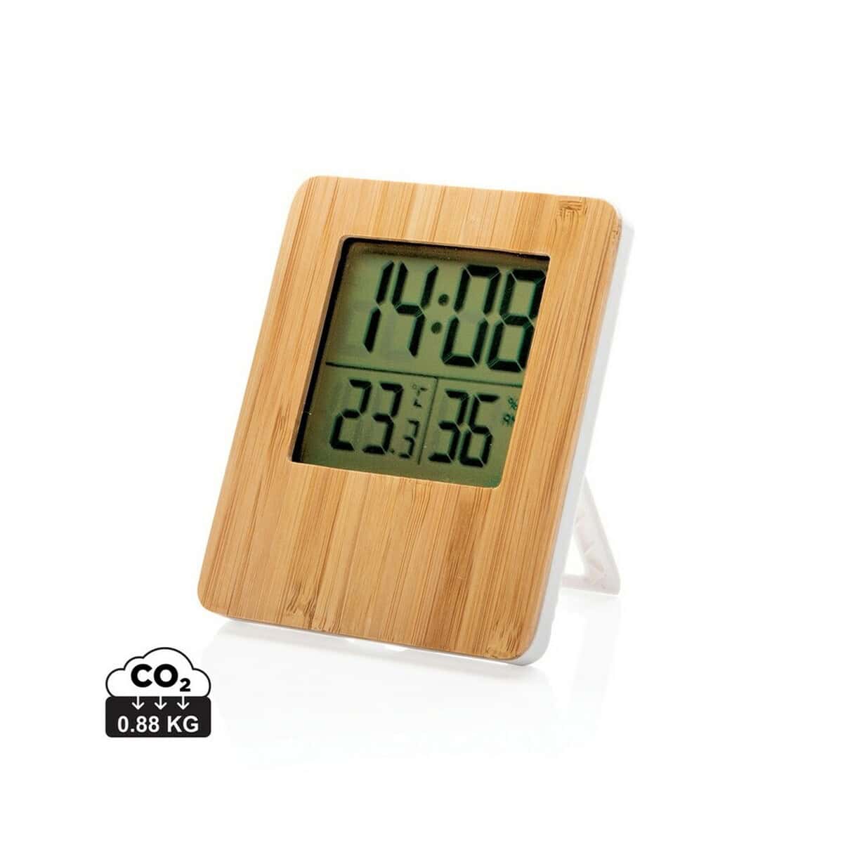 Bambusowa stacja pogodowa to znakomity, ekologiczny gadżet, który przyciągnie wzrok każdego odbiorcy kampanii promocyjnej. Wykonana z naturalnego bambusa i wytrzymałego ABS, wpisuje się w trend zrównoważonego rozwoju, a jej ślad węglowy wynosi zaledwie 0,88 kg CO2 🙂. Niewielkie wymiary 9,9 × 12 × 1,8 cm sprawiają, że urządzenie doskonale prezentuje się zarówno na biurku menedżera, jak i w domowym salonie. To propozycja szczególnie ceniona przez branżę OZE, firmy architektoniczne, agencje nieruchomości, hotele oraz producentów kosmetyków naturalnych, którzy chcą podkreślić swoje proekologiczne wartości.