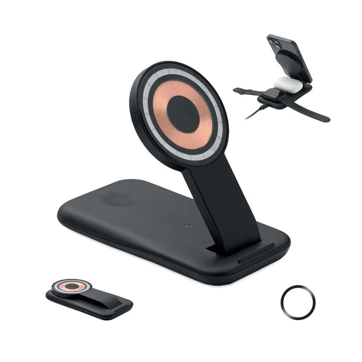 Produkt będzie perfekcyjnym wyborem dla dynamicznych menedżerów, przedstawicieli handlowych, studentów oraz wszystkich miłośników Apple®, którzy chcą ładować iPhone’a, słuchawki i zegarek w jednym miejscu. Na biurku posłuży jako elegancki stand do wideopołączeń, a w domu – jako nocna stacja dokująca. Dodatkowy magnetyczny pierścień zwiększa kompatybilność z modelami spoza serii MagSafe, co poszerza grono odbiorców 🙂.