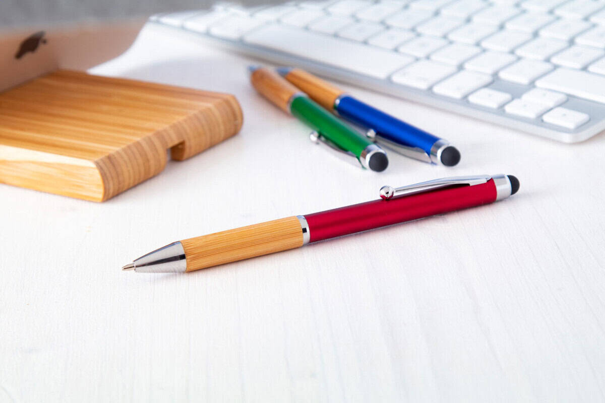 Bollys długopis dotykowy to wszechstronny, przyjazny środowisku gadżet, który odmieni codzienną komunikację Twoich klientów oraz pracowników 🙂. Korpus o wymiarach ø10 × 130 mm wykonano z połączenia gładkiego plastiku i naturalnego bambusa, dzięki czemu produkt świetnie wpisuje się w segment „Długopisy ekologiczne z logo”. Elegancji dodają mu metaliczne wykończenia oraz błyszczące, chromowane detale, a całość waży zaledwie 6,5 g, co czyni go wyjątkowo poręcznym w każdej sytuacji. Dostępność pięciu intensywnych kolorów – zielonego, czarnego, czerwonego, niebieskiego i srebrnego – pozwala dopasować barwę do identyfikacji wizualnej dla Twojej firmy.