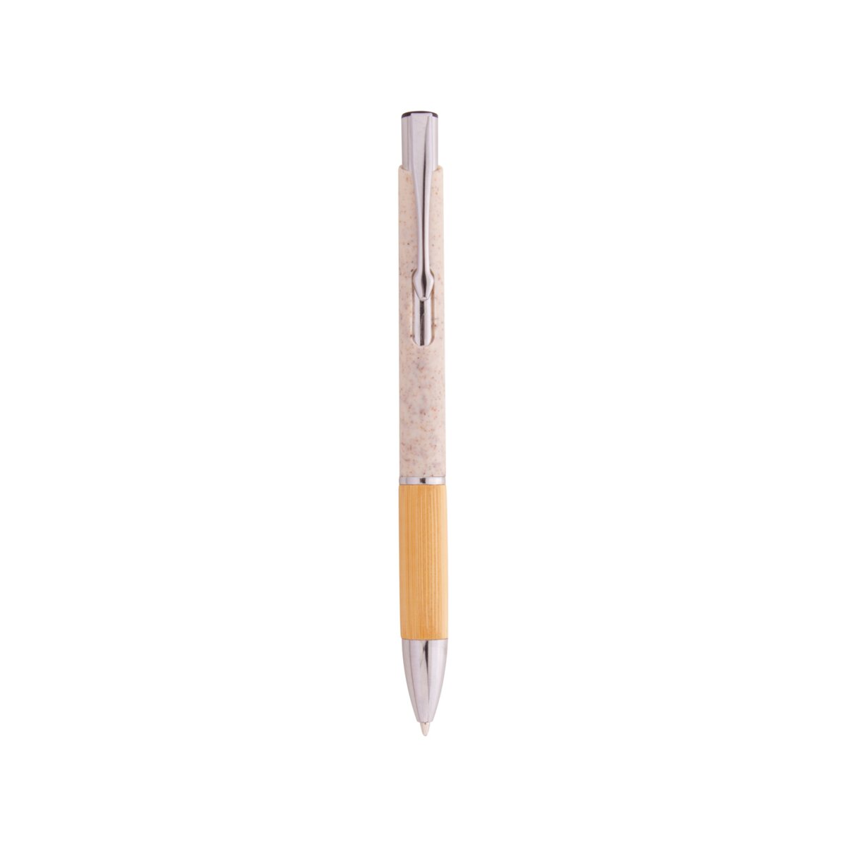 Jego ekologiczny plastikowy korpus został starannie wykończony słomą pszeniczną, która zapewnia nie tylko trwałość, ale także przyjemny wygląd. Uchwyt długopisu wykonany został z wytrzymałego bambusa, o naturalnych walorach dekoracyjnych. Metalowe elementy są odporne na uszkodzenia mechaniczne i zapewniają długotrwałą wytrzymałość.