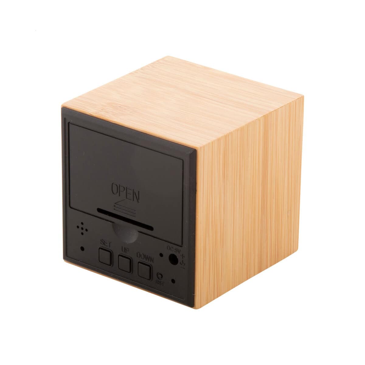 Wbudowany wyświetlacz pokazuje godzinę, datę i temperaturę, czyniąc ten model nie tylko budzikiem, lecz również praktycznym termometrem. Możliwość zasilania przez dołączony kabel USB albo 3 baterie AAA gwarantuje swobodę użytkowania w podróży, na stanowiskach targowych czy w salach konferencyjnych. Materiał: Bambus oraz naturalny, jasny kolor stanowią o jego przyjaznym środowisku charakterze, a to coraz częściej doceniają klienci, którzy poszukują ekologicznych rozwiązań.