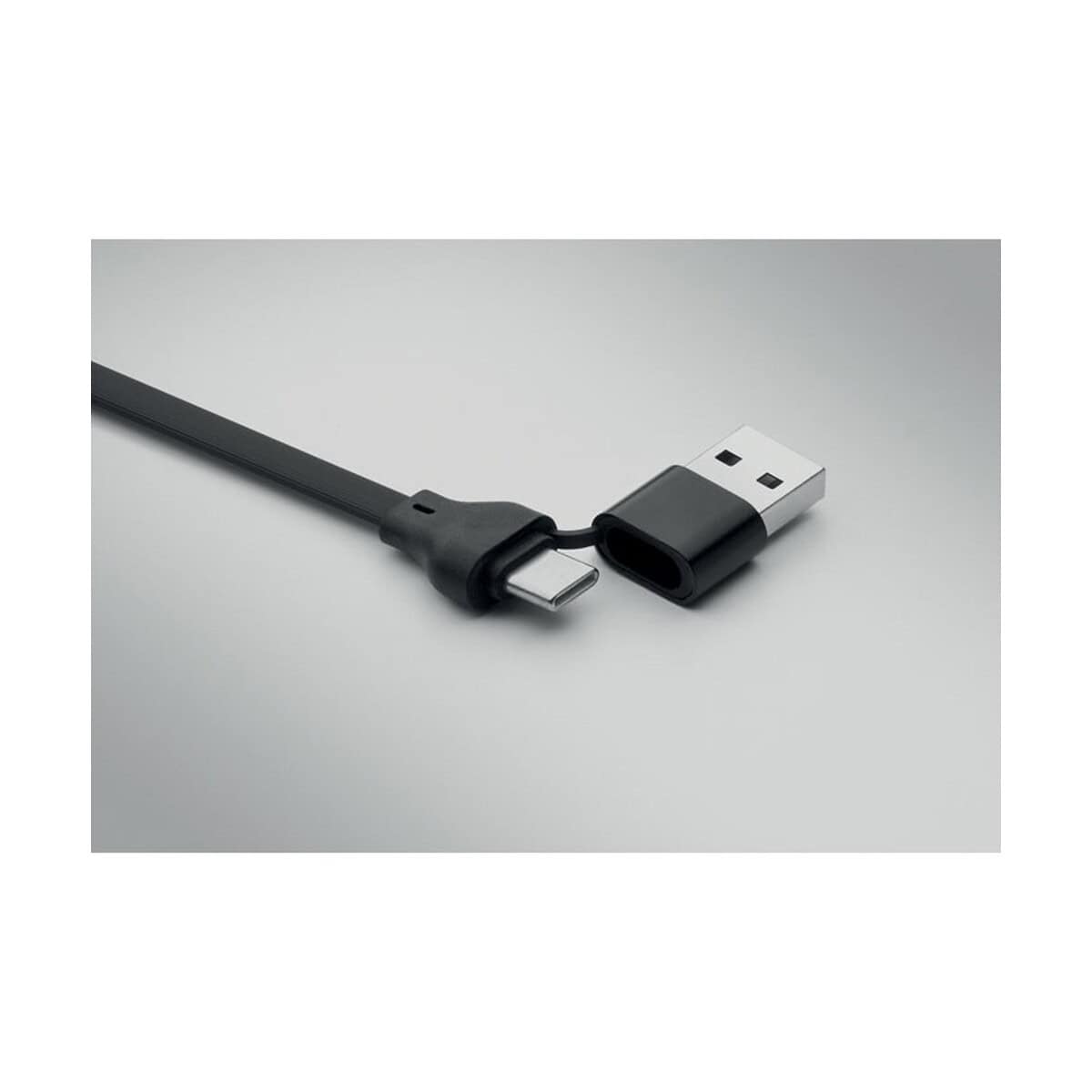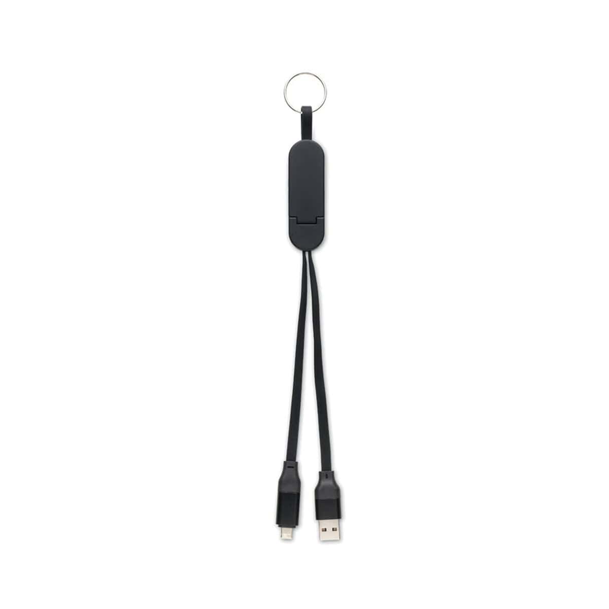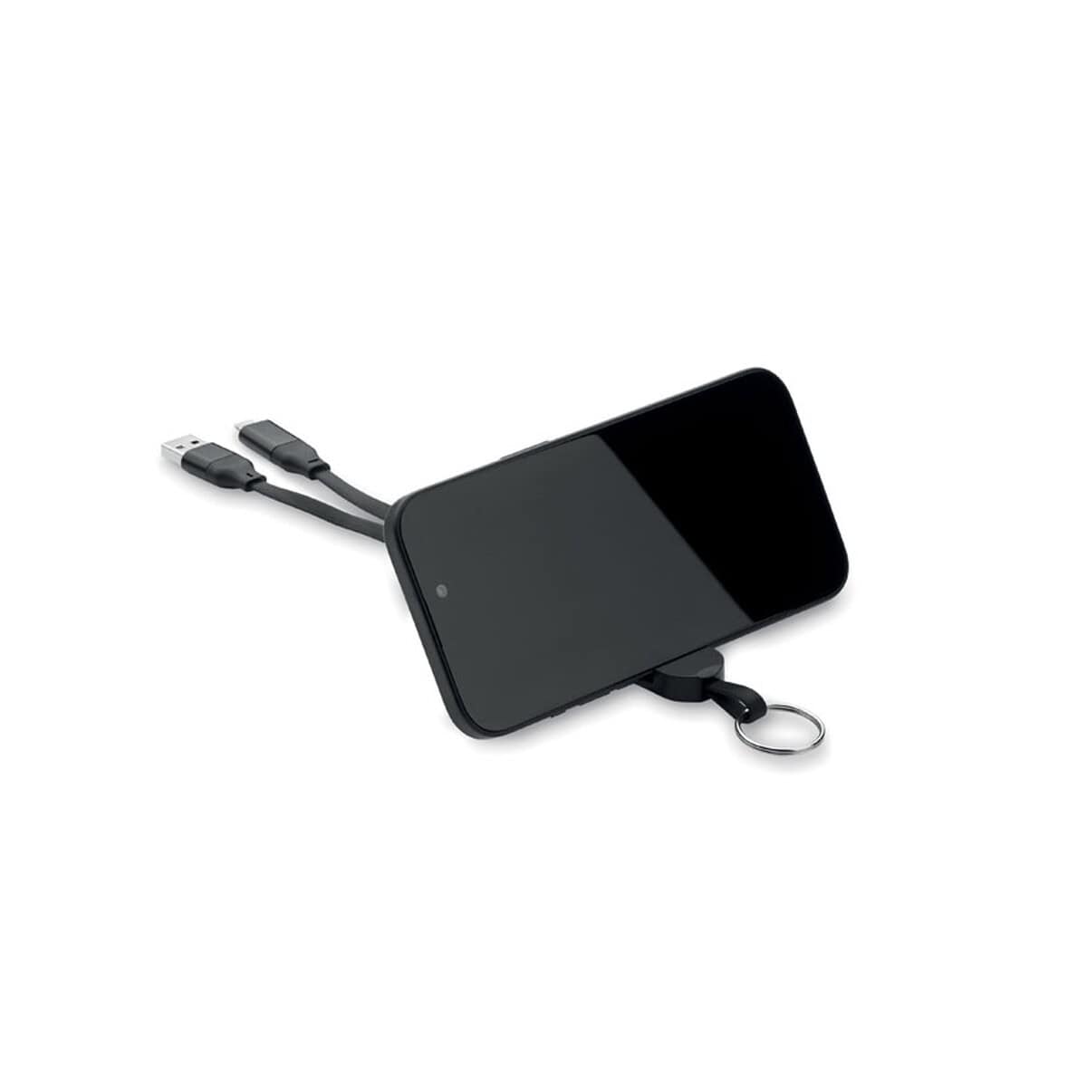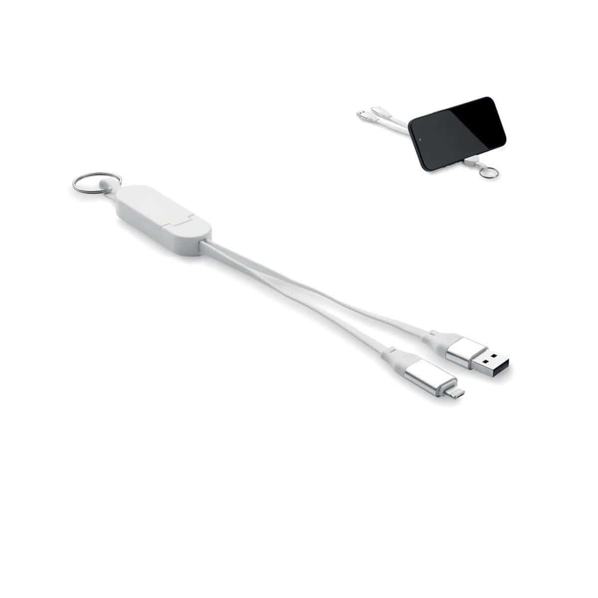 Ten skuteczny w promocji gadżet reklamowy łączy w sobie trzy funkcje: solidny brelok, praktyczną podstawkę pod telefon oraz kabel „3 w 1”. Wejścia Typ-C i Typ-A oraz wyjścia Typ-C i micro-B (2 w 1 pin) ukryte są w estetycznej, półprzezroczystej obudowie dostępnej w dwóch kolorach – eleganckiej czerni i uniwersalnej bieli. Długość kabla 26 cm gwarantuje komfort podczas ładowania lub transferu danych, a jednocześnie mieści się w kieszeni czy damskiej torebce.