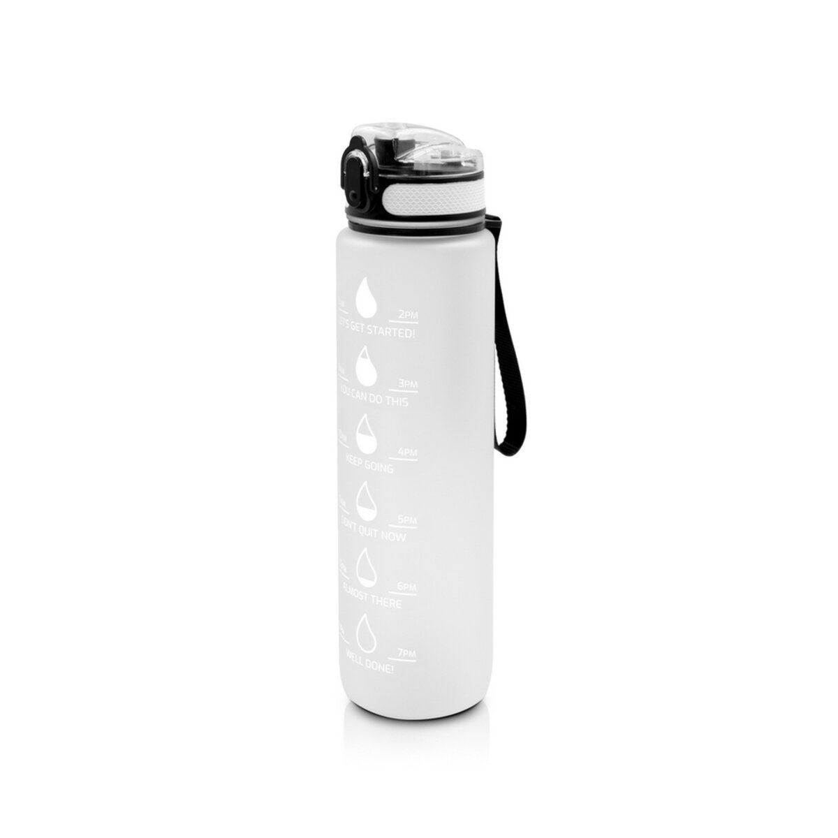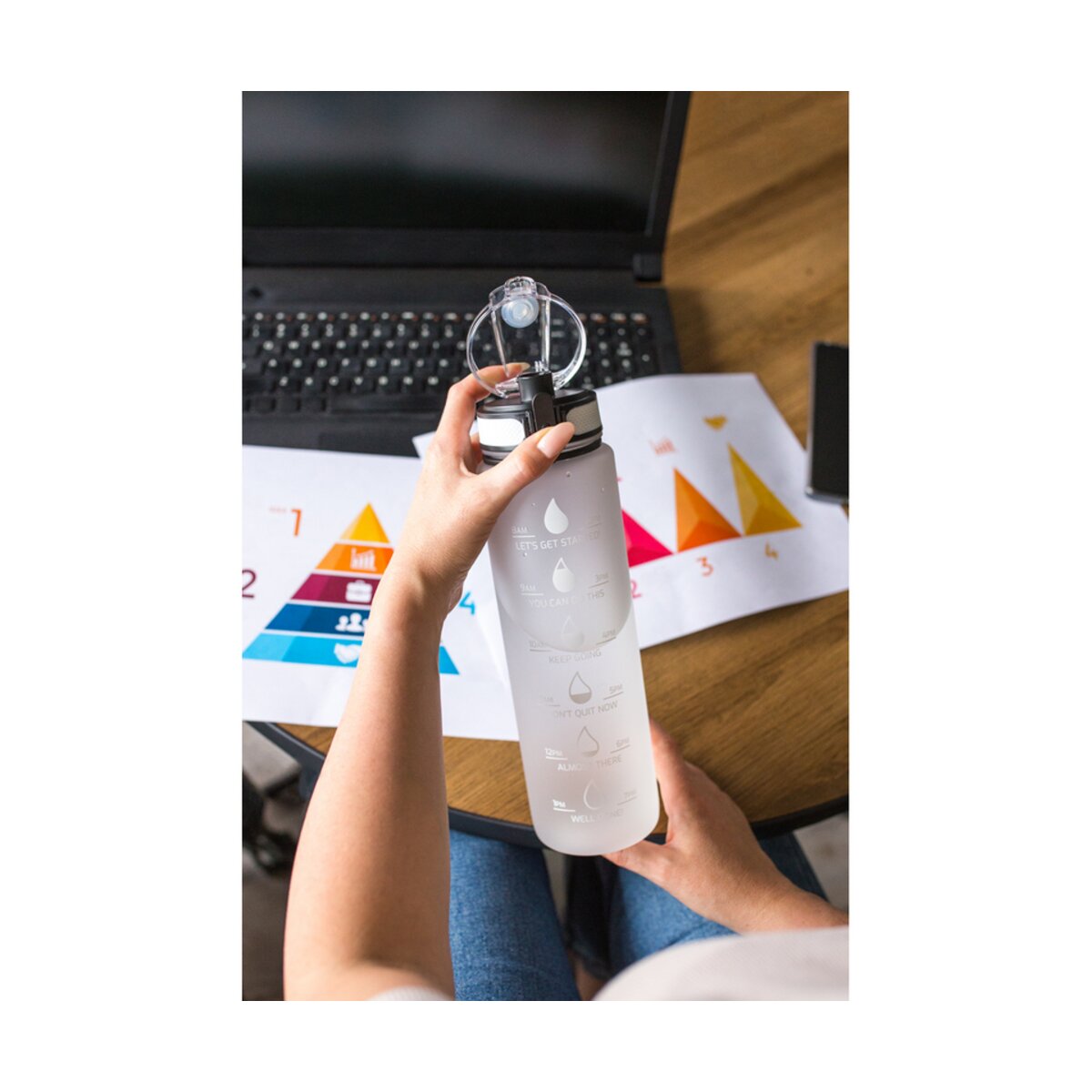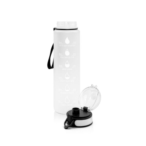 Butelka posiada skalę ml z jednej strony i miarkę motywacyjną z drugiej strony, co pomaga w monitorowaniu ilości spożywanego płynu i zachęca do osiągnięcia dziennego celu nawodnienia. Wygodne zamknięcie z blokadą zapobiega przypadkowemu rozlaniu, a pasek na rękę (dostarczany oddzielnie) umożliwia łatwe przenoszenie. Butelka, dzięki gumowanemu wykończeniu, zapewnia pewny chwyt nawet podczas intensywnego treningu.