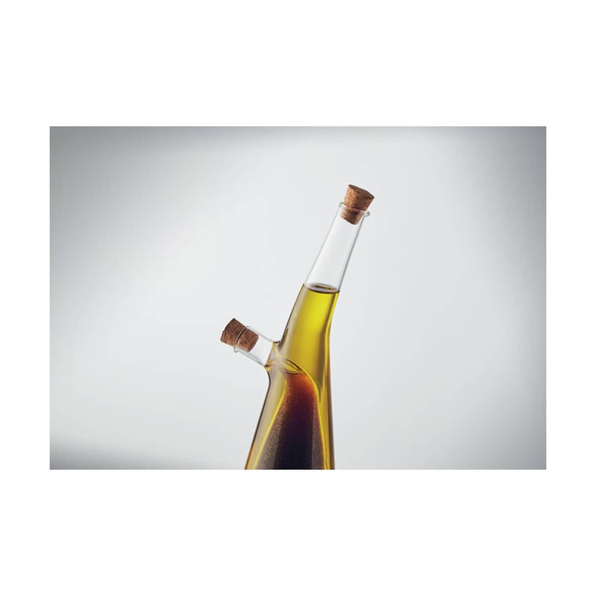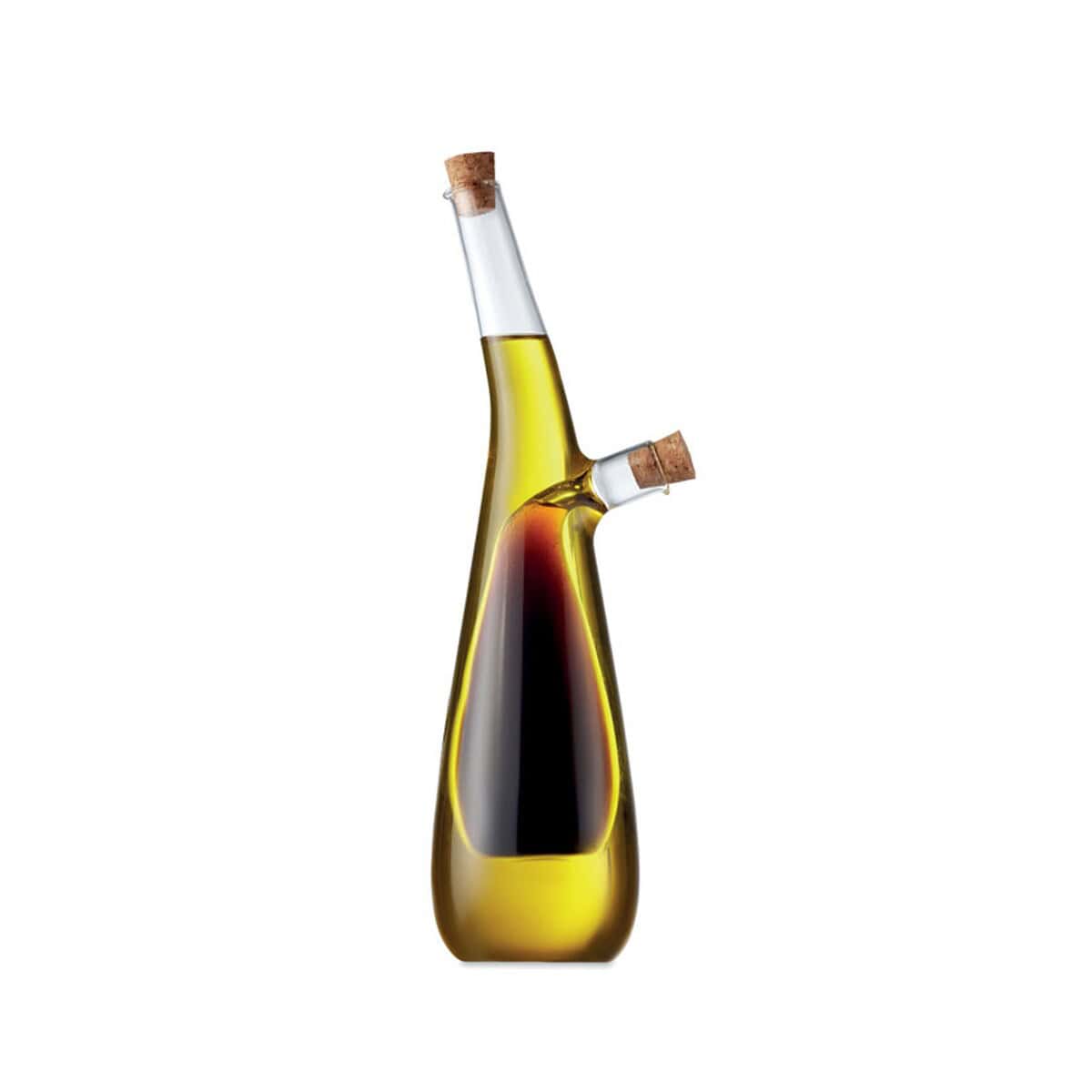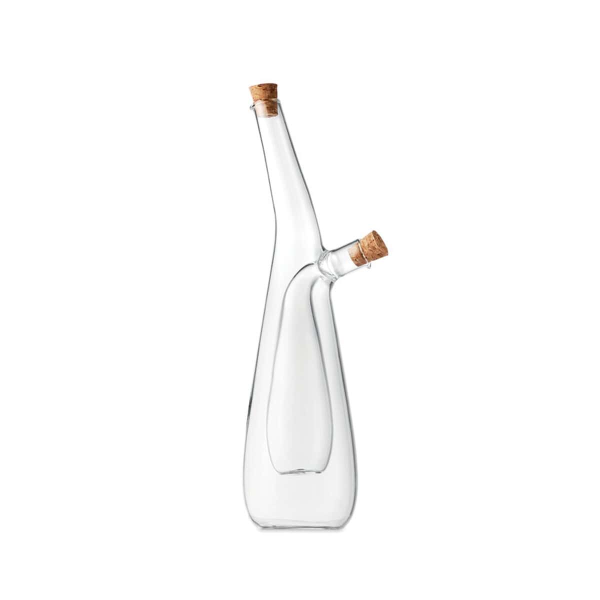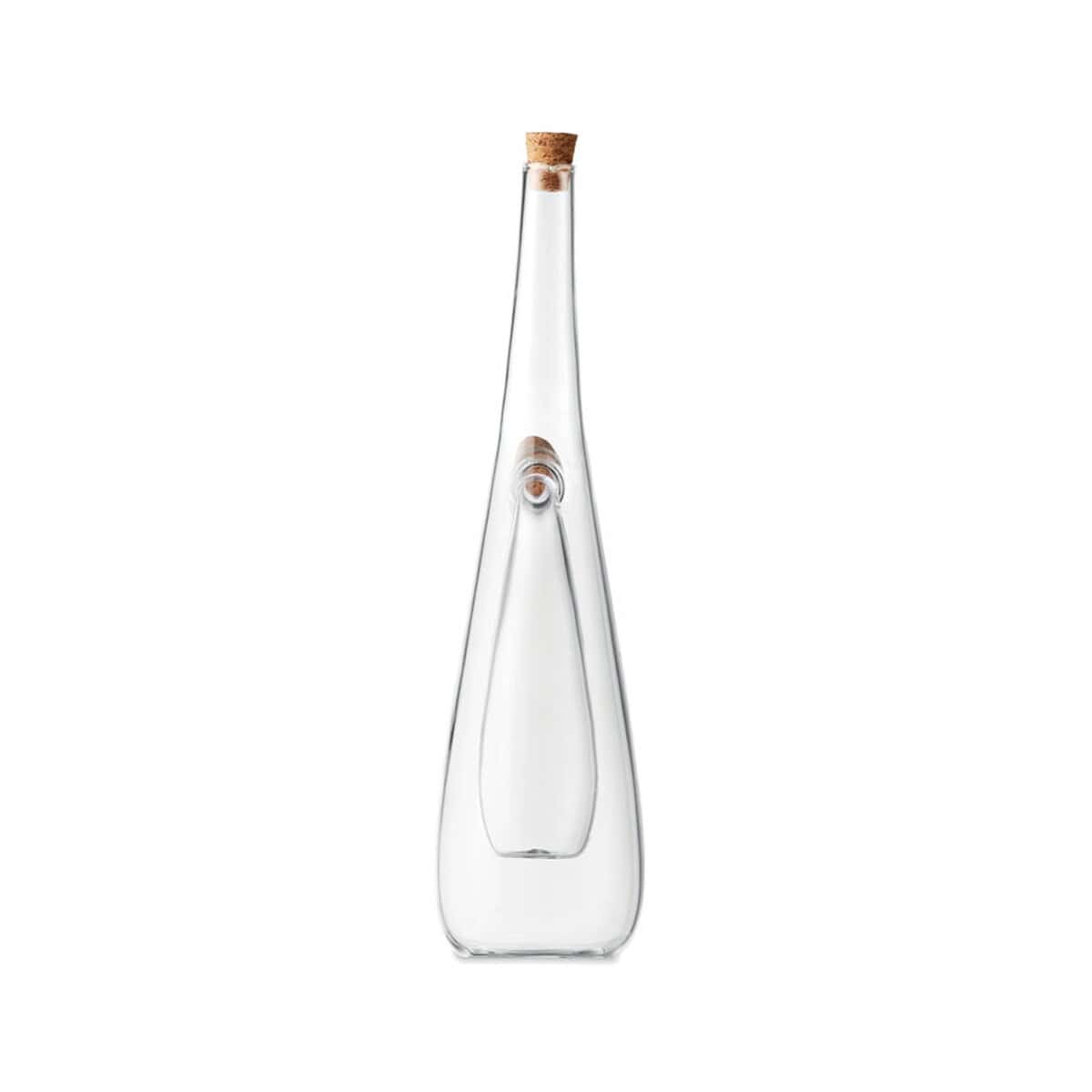 Butelka na oliwę i ocet BARRETIN to znakomity, funkcjonalny i stylowy gadżet stworzony z myślą o restauracjach, firmach cateringowych oraz producentach zdrowej żywności, którzy szukają oryginalnego nośnika logo 🙂 Transparentne, borokrzemowe szkło ukazuje kolor oliwy i octu, podkreślając ich jakość, a dwie osobne komory – pojemność zewnętrzna 300 ml i wewnętrzna 80 ml – pozwalają serwować oba płyny w jednym, eleganckim naczyniu. Naturalne korkowe zatyczki nie tylko szczelnie chronią aromaty, ale też kontrastują z błyszczącym szkłem, przyciągając wzrok gości.