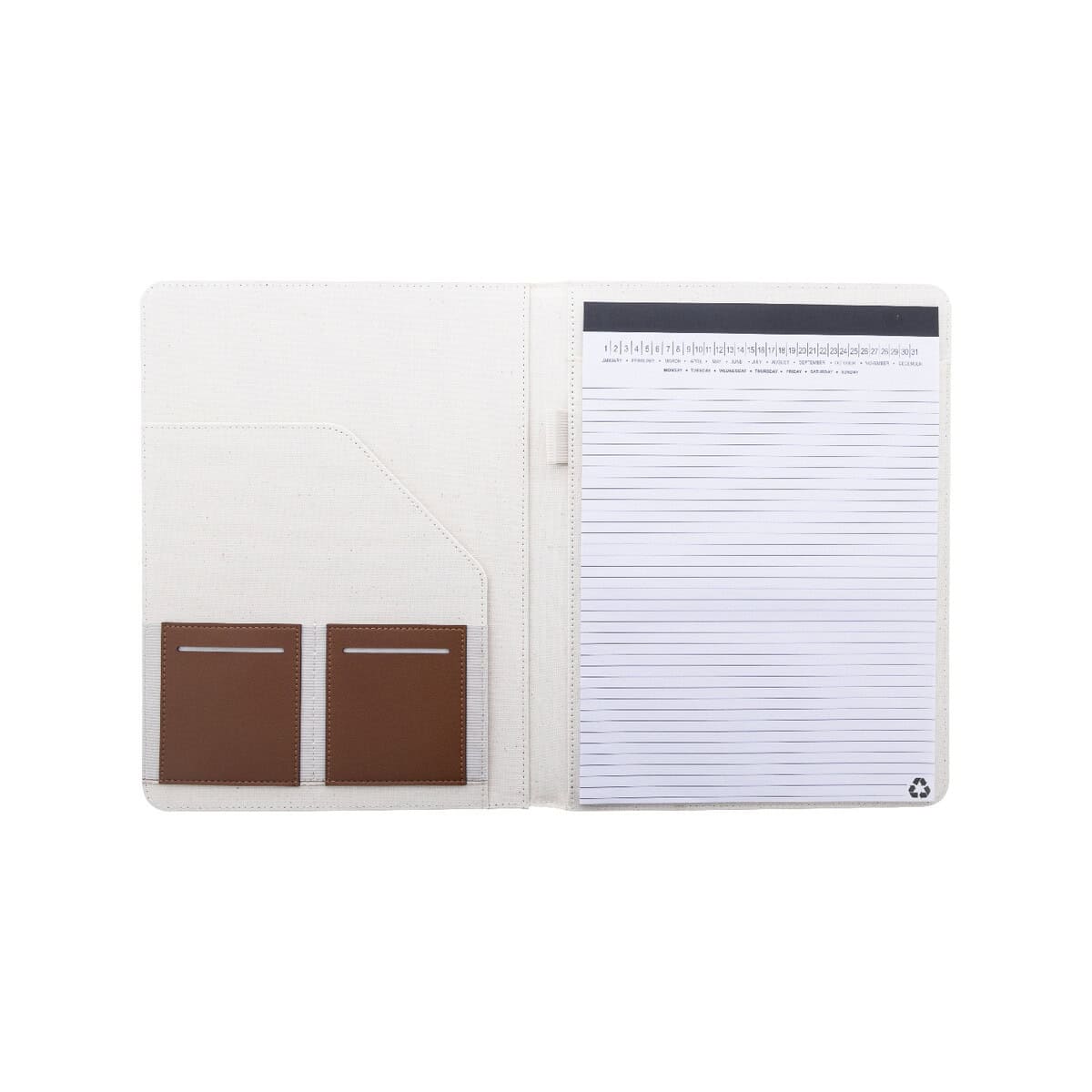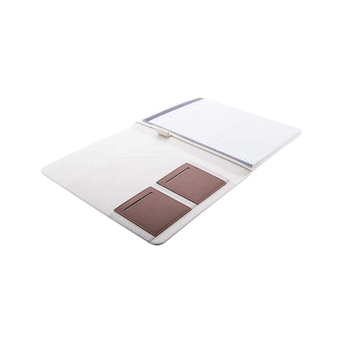 W środku teczkę wyposażono w liczne kieszenie organizacyjne oraz notatnik w linie (20 kartek) z papieru z recyklingu, co tworzy kompletny zestaw pracy mobilnej. Naturalny kolor płótna stanowi znakomite tło pod logo lub efektowny nadruk, a duża powierzchnia znakowania pozwala wyeksponować identyfikację wizualną dla Twojej firmy. Dzięki temu Carbasa A4 teczka na dokumenty z płótna pochodzącego z recyklingu sprawdzi się jako prestiżowy upominek reklamowy, budujący wizerunek odpowiedzialnej marki.
