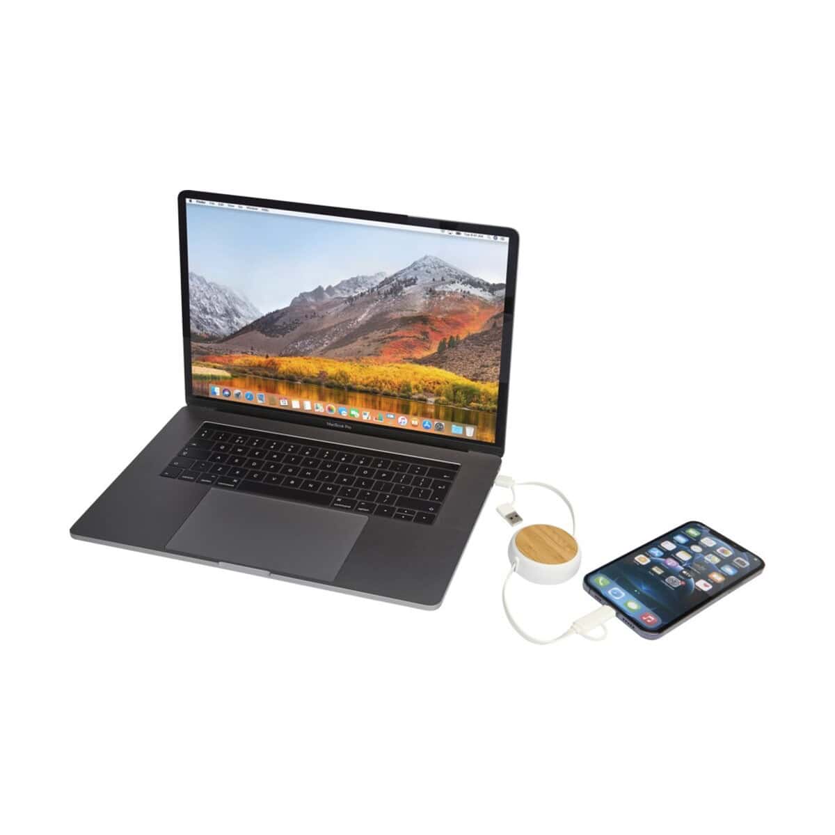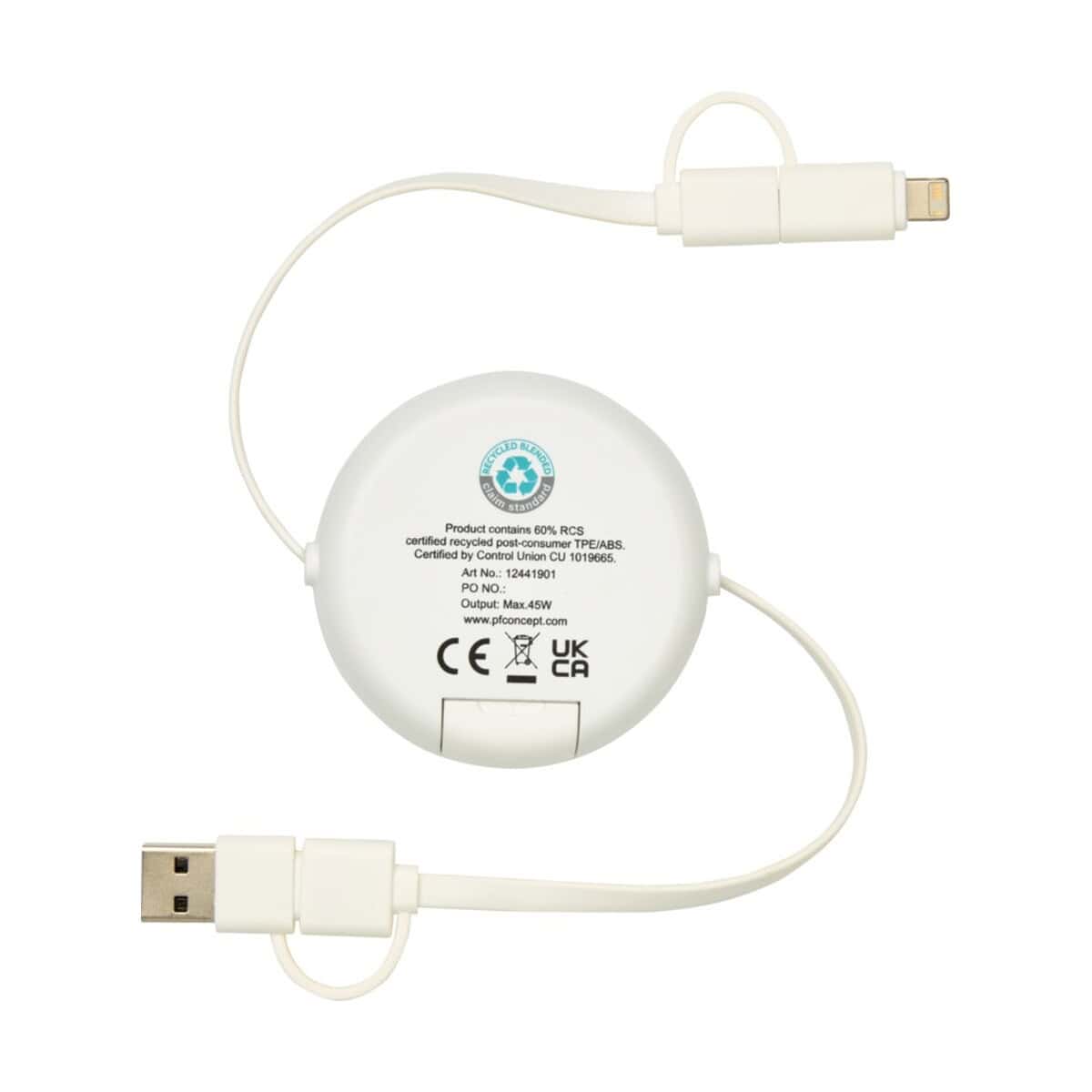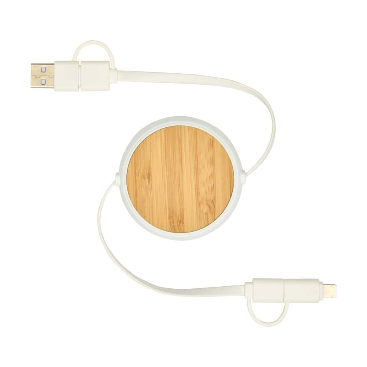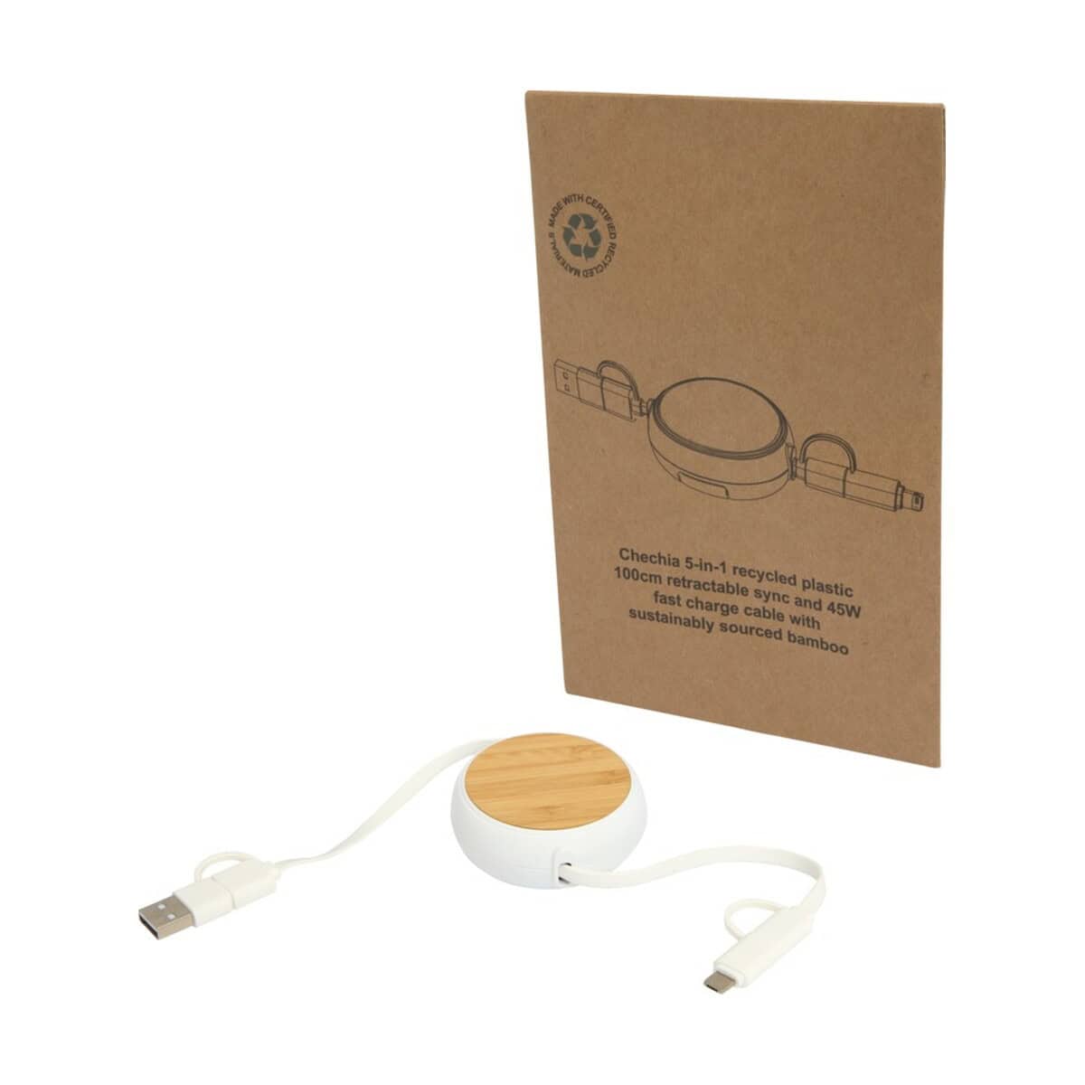 Chechia zwijany kabel do synchronizacji danych i szybkiego ładowania 5 w 1 45 W o długości 100 cm z tworzyw sztucznych pochodzących z recyklingu z detalami z bambusa znakomicie sprawdzi się w branżach technologicznej, e-commerce, motoryzacyjnej czy eventowej. Jako ekologiczny gadżet reklamowy z logo stanie się praktycznym prezentem dla klientów salonów GSM, dealerów samochodowych, firm transportowych, a także agencji marketingowych szukających nieszablonowych rozwiązań. Dla pracowników działów sprzedaży będzie perfekcyjnym narzędziem do ładowania smartfonów i tabletów w trasie, natomiast studenci oraz digital nomadzi docenią kompatybilność z CarPlay i Android Auto 🚗.