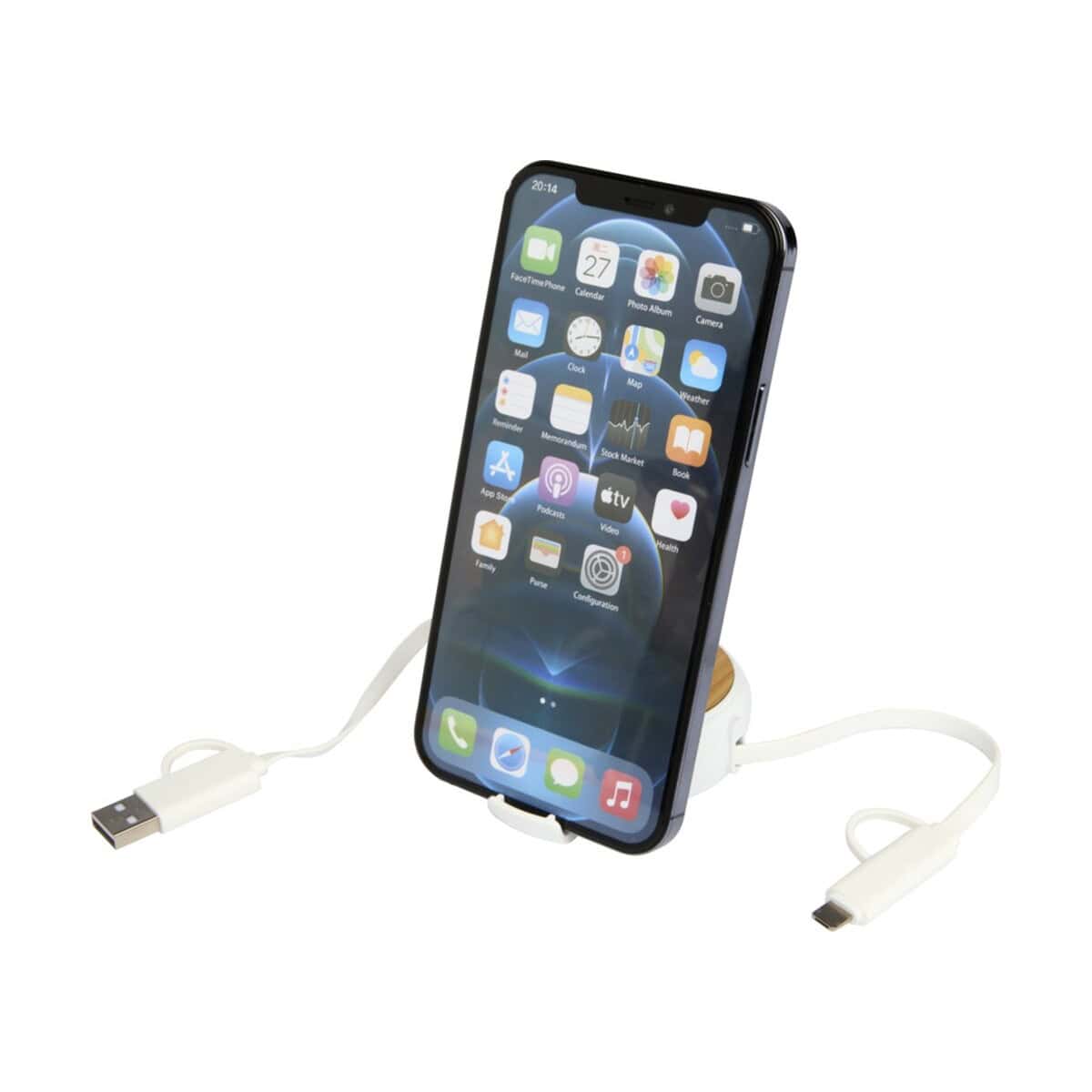 Chechia zwijany kabel do synchronizacji danych i szybkiego ładowania 5 w 1 45 W o długości 100 cm z tworzyw sztucznych pochodzących z recyklingu z detalami z bambusa to nowoczesny, a przy tym przyjazny środowisku gadżet, który zachwyci każdego fana technologii. Wykonany z lekkiego (48 g) ABS z odzysku oraz certyfikowanego bambusa FSC, łączy się ze złączami USB-A, USB-C, Lightning i Micro USB, oferując aż 45 W mocy przy połączeniu USB-C do USB-C. Dzięki zwijanej konstrukcji kabel ma kompaktowe wymiary 100 × 2,2 × Ø 6,1 cm, więc bez trudu zmieści się w kieszeni plecaka czy torby. Wbudowana podstawka pod telefon ułatwia oglądanie filmów i prowadzenie wideokonferencji – zarówno w domu, biurze, jak i w podróży ✈️.