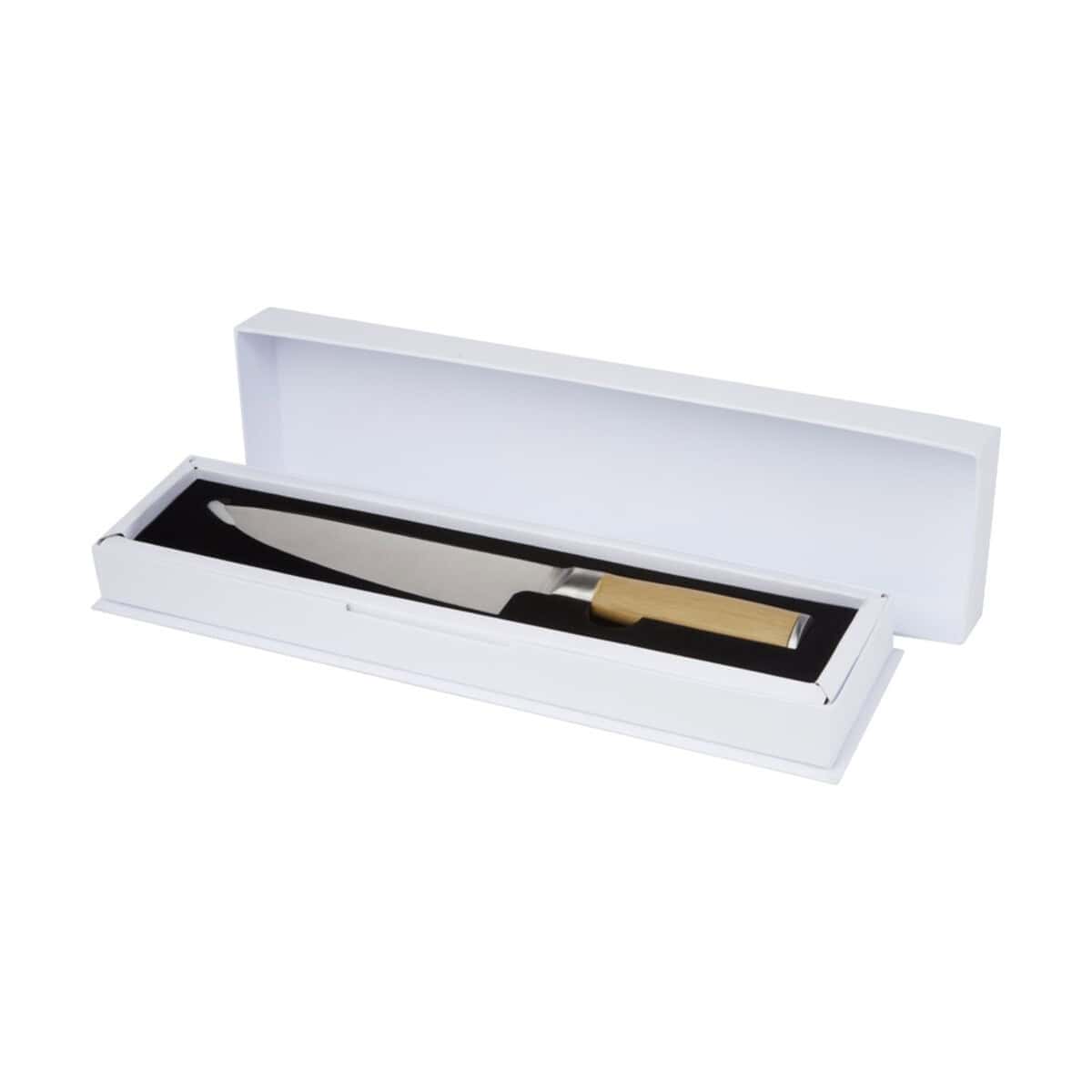 Dzięki dużej powierzchni klingi łatwo umieścisz czytelne logo bądź hasło promocyjne, a naturalna struktura bambusa pięknie wyeksponuje każdy nadruk. Zestawiając ten produkt z deską do krojenia lub fartuchem, stworzysz praktyczny pakiet reklamowy dla Twojej firmy, który wyróżni Cię na targach, eventach kulinarnych czy w programach lojalnościowych. Postaw na ten znakomity nóż i zobacz, jak funkcjonalny, designerski artykuł kuchenny może skutecznie promować Twoją markę.