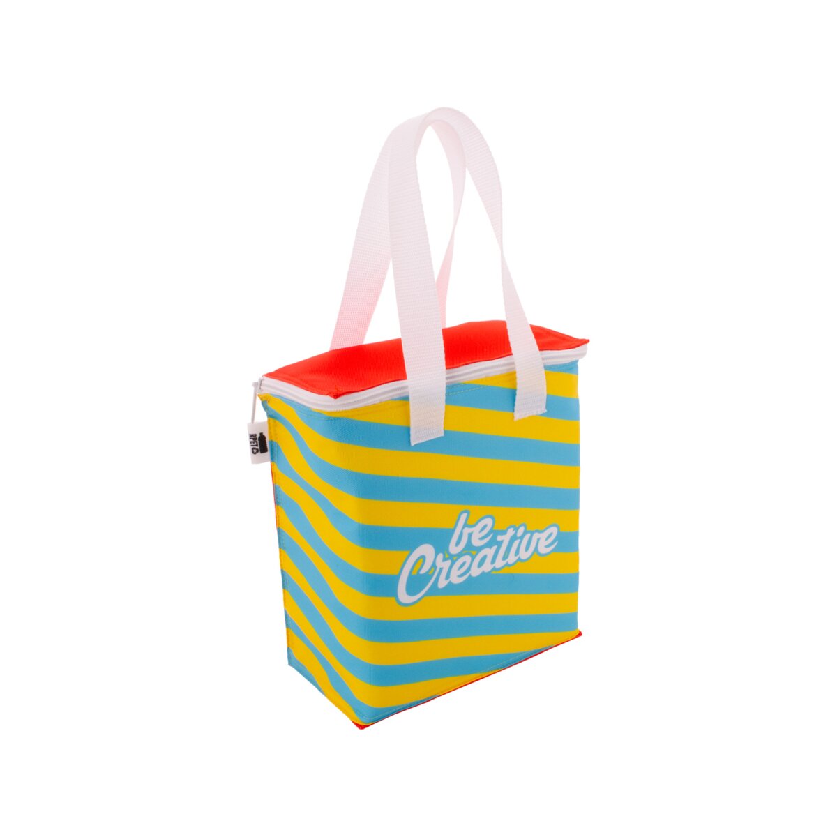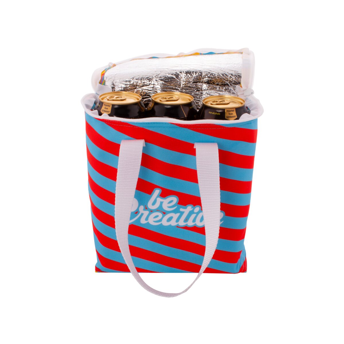 Zapinana na zamek torba termoizolacyjna sprawdzi się idealnie, gdy chcesz mieć zawsze pod ręką swoje ulubione napoje. Wykonana z wytrzymałego poliestru 600D RPET z aluminiowym wypełnieniem, jest bezpieczna dla środowiska. Dzięki zastosowaniu sublimacji, personalizowana torba zachwyca doskonale wyglądającą grafiką, która nadrukowana jest na całej jej powierzchni. Dodatkowo, charakterystyczna metka RPET dopełnia jej wyglądu. Torba jest wystarczająco pojemna, aby pomieścić 6 puszek 0,33 L. Minimalna ilość, którą można zamówić to 50 sztuk.