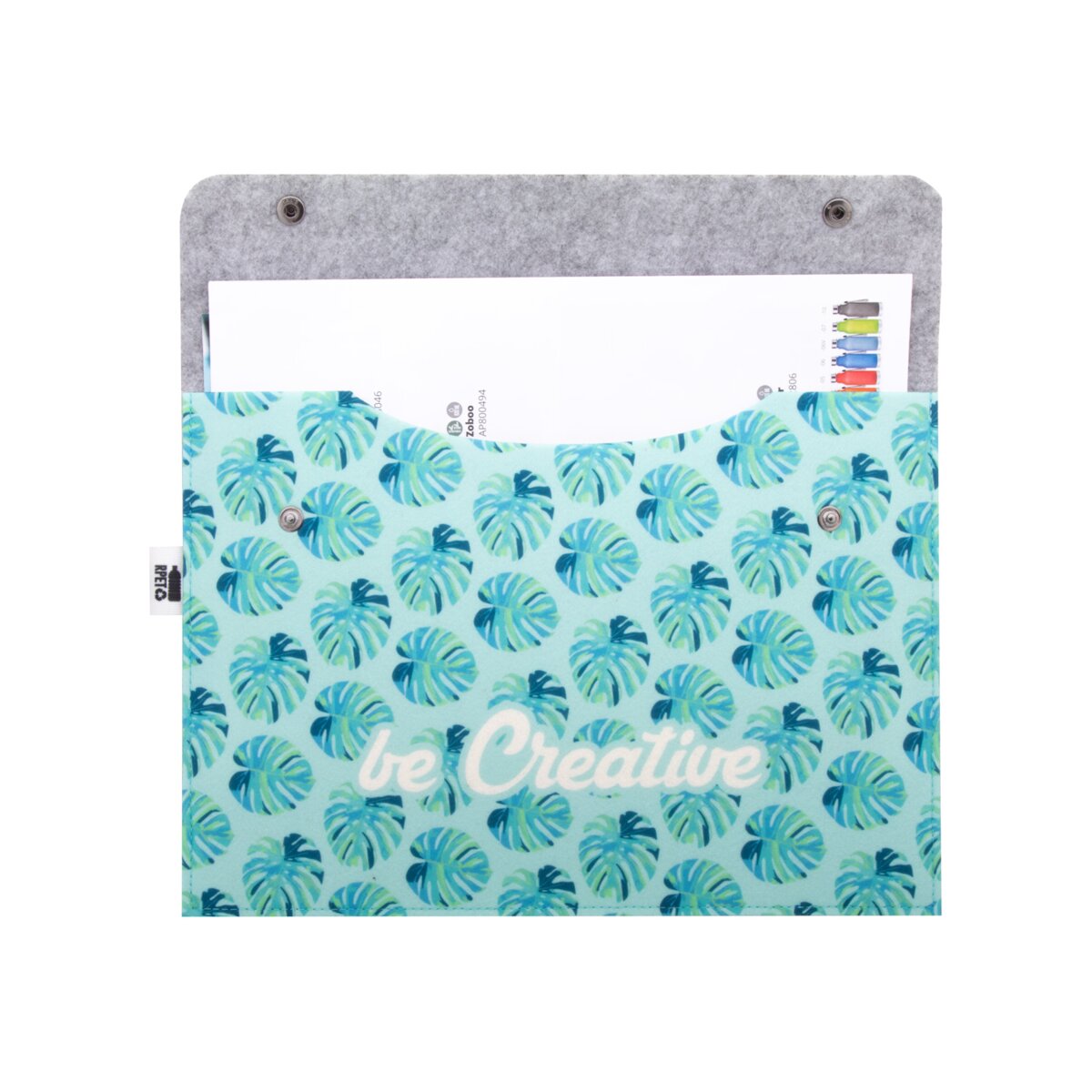 Jeśli szukasz ekologicznego i praktycznego produktu, to nasza personalizowana teczka z filcu RPET jest idealnym rozwiązaniem! To, co wyróżnia naszą teczkę, to charakterystyczna metka RPET oraz full kolorowy nadruk z przodu, wykonany techniką sublimacyjną. Cechuje ją również wytrzymałe zapięcie na zatrzask.