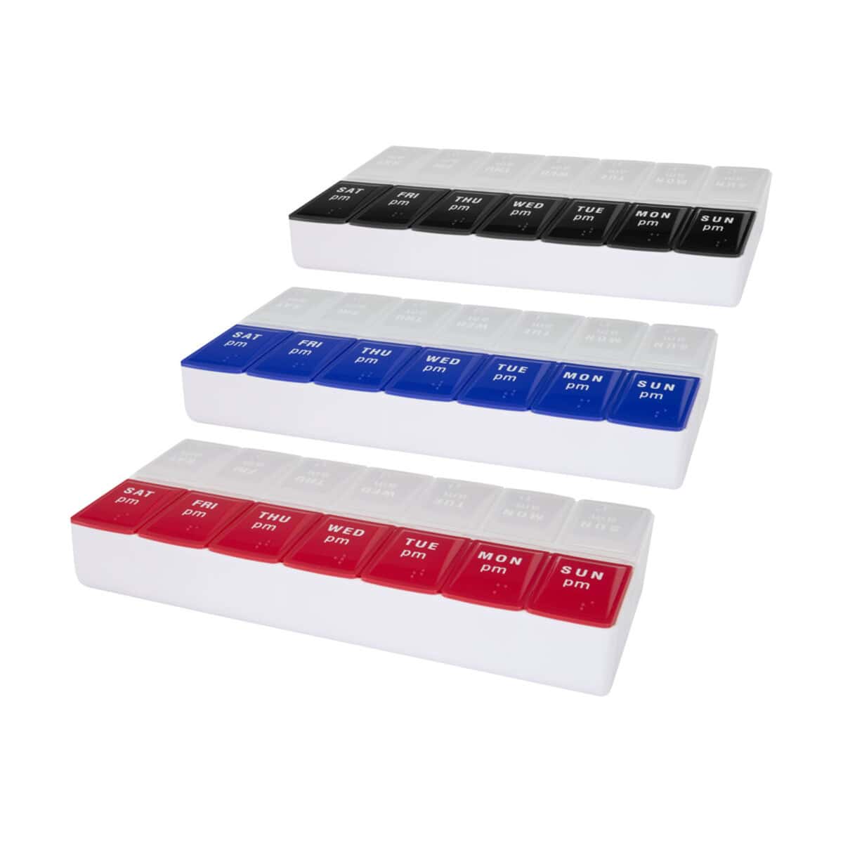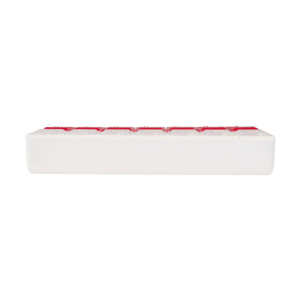 Ten kompaktowy, a zarazem niezwykle wytrzymały organizer jest wyjątkowo przyjazny w użytkowaniu zarówno podczas podróży służbowych, jak i w domowym zaciszu. Dostępny w wyrazistych kolorach – niebieskim lub czerwonym – przyciąga wzrok i ułatwia szybkie odróżnienie od innych akcesoriów. Przezroczyste wieczka pozwalają zobaczyć zawartość bez otwierania każdej przegródki, co jeszcze bardziej upraszcza codzienną rutynę.