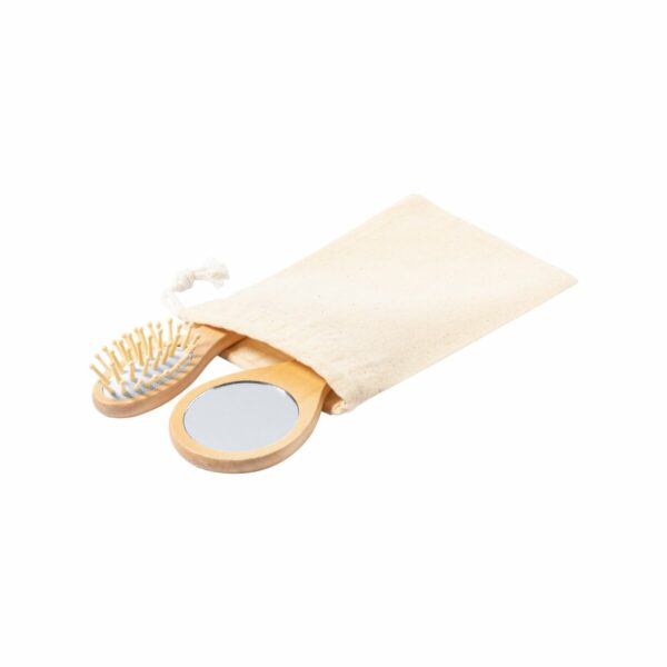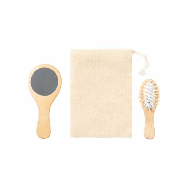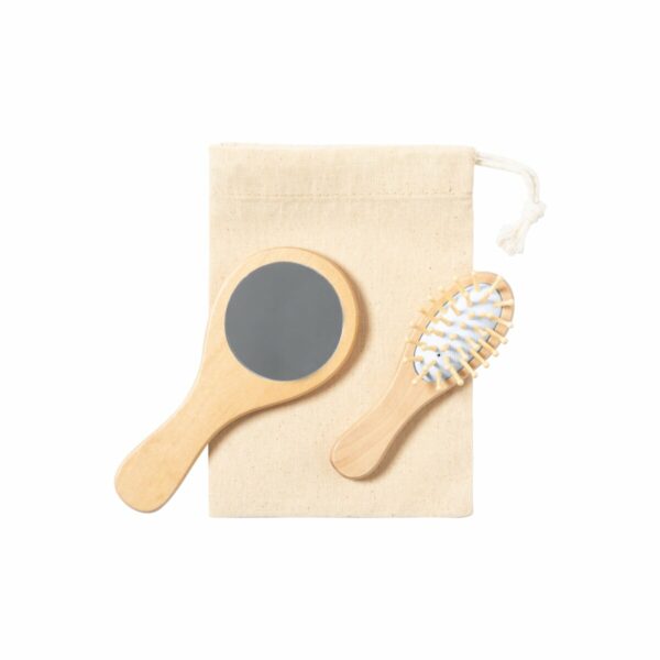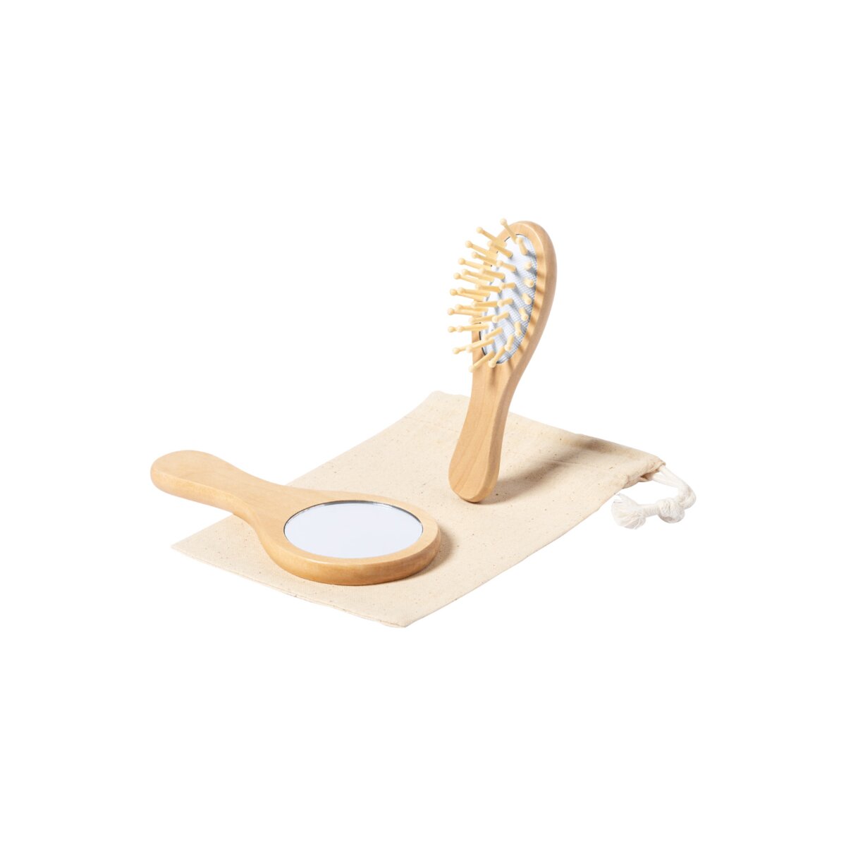 Komplet z pewnością przypadnie Ci do gustu. Wykonana z drewna szczotka do włosów jest delikatna dla skóry i włosów – dzięki temu zadbasz o kondycję swoich włosów. Przyjemnie masuje skórę głowy i wygładza powierzchnię włosów. Lusterko kosmetyczne w kompaktowym rozmiarze pozwoli Ci zobaczyć swoją twarz w pełnej okazałości.
