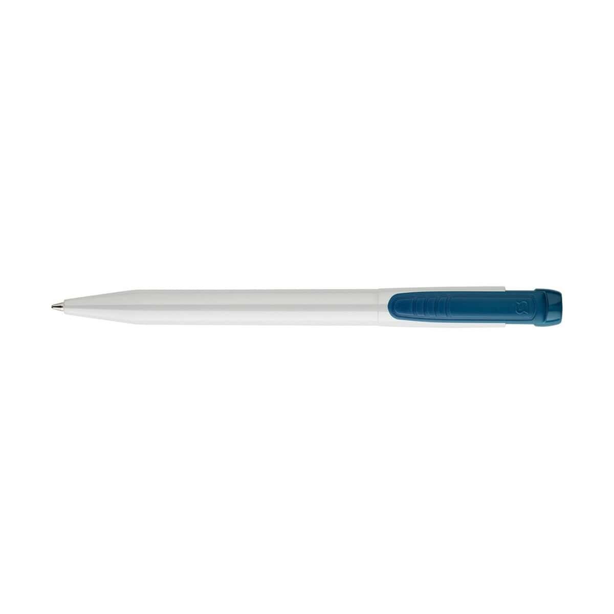 Długopis Stolinea to doskonały, przyciągający spojrzenia gadżet, który stanie się wizytówką każdej kampanii promocyjnej 😊. Biały trzon kontrastuje tu z bogatą paletą barw klipu – od błękitnego, przez limonkowy i fuksję, aż po elegancką czerń. Dzięki wymiarom ø1,4 × 13,5 cm i wadze zaledwie 9 g produkt jest lekki, a jednocześnie solidny, bo wykonany z ABS, plastiku, niklu i metalu. Wkład w intensywnie niebieskim kolorze kryje w sobie renomowany tusz German Dokumental Ink, gwarantując płynne i równomierne prowadzenie linii. ✍️