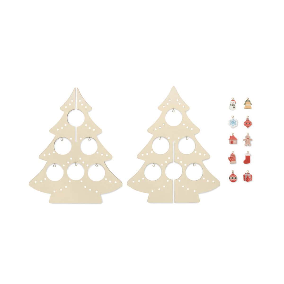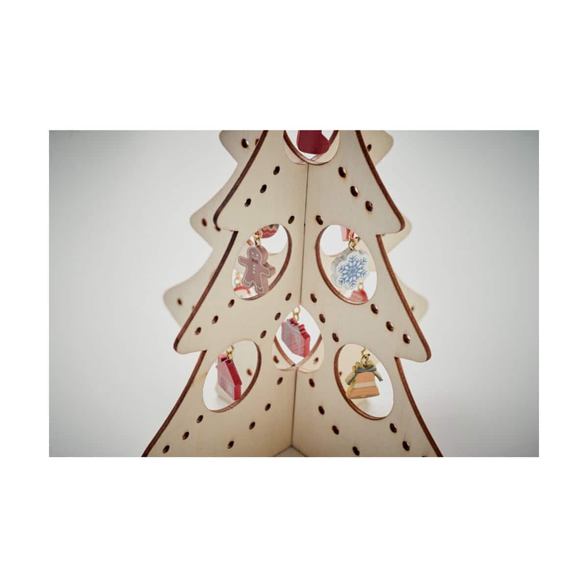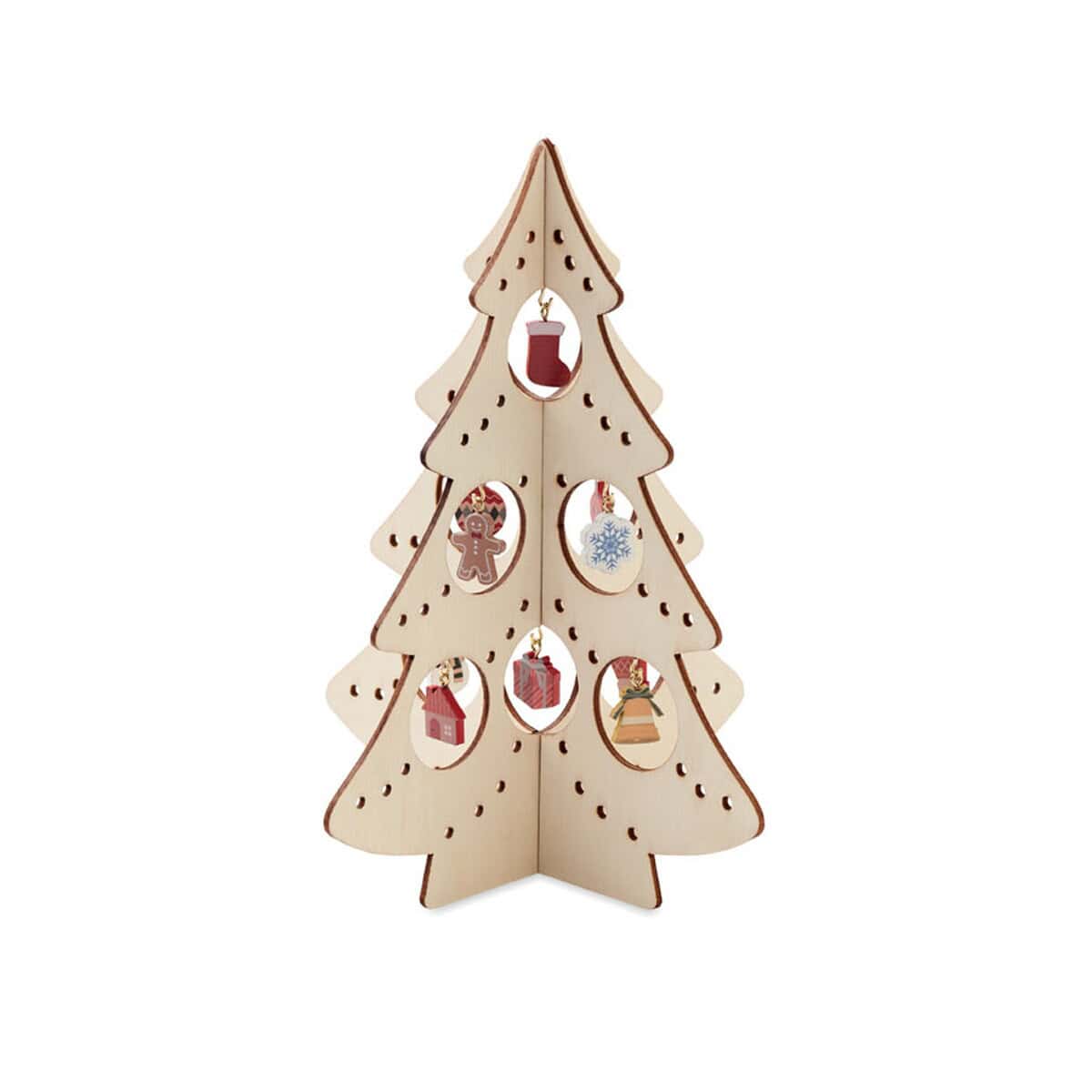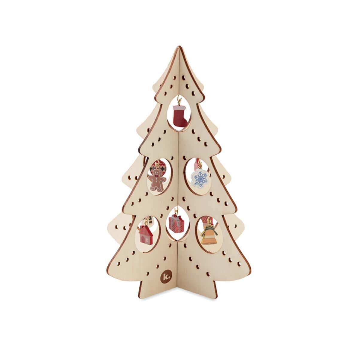 W zestawie znajduje się drewniana choinka do samodzielnego złożenia wraz z 10 różnorodnymi zawieszkami, co gwarantuje kreatywną zabawę i angażuje odbiorców w personalizację prezentu. Wymiary: 16×16×19,8 cm pozwalają ustawić dekorację na biurku, ladzie recepcyjnej czy na półce w salonie. Przy niewielkiej wadze: 0,071 kg produkt jest lekki i łatwy w transporcie, a naturalny materiał: wood oraz kolor: drewniany wpisują się w modny trend eko. 🙂
