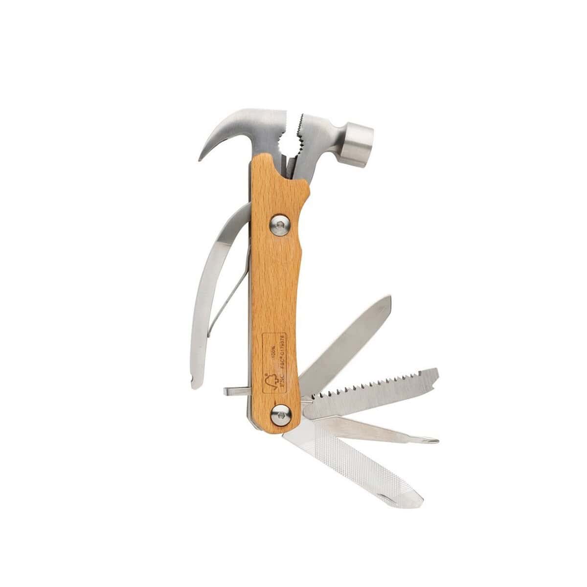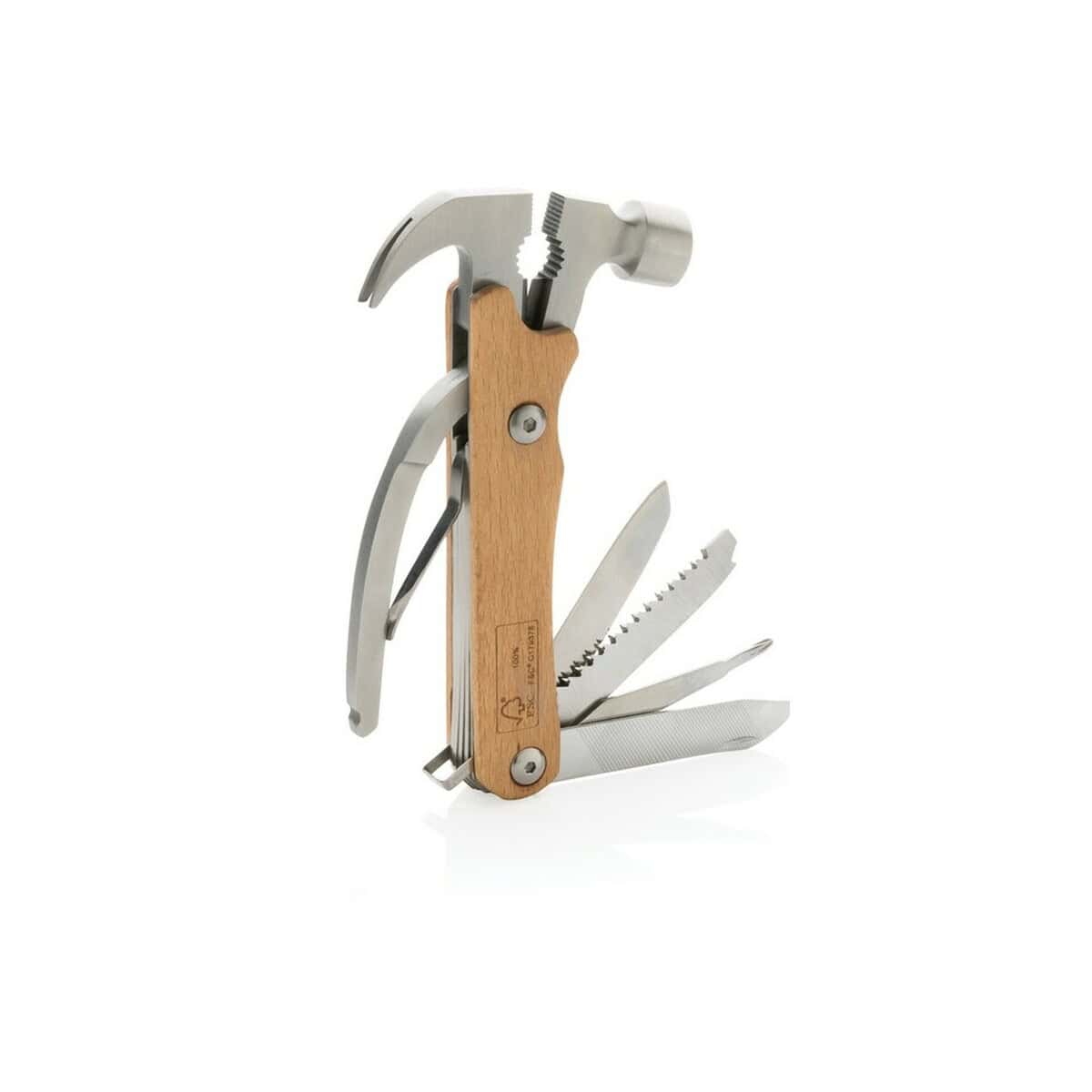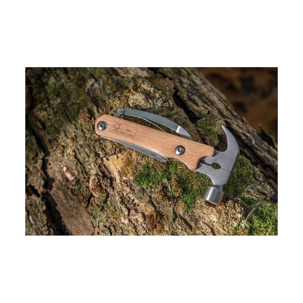 Drewniane narzędzie wielofunkcyjne „młotek” to niezwykle praktyczny, a zarazem estetyczny gadżet, który łączy w sobie funkcje młotka, szczypiec, noża, śrubokrętu i otwieracza. Całość powstała z certyfikowanego drewna FSC® w naturalnym, brązowym odcieniu oraz wytrzymałej stali nierdzewnej, co gwarantuje długą żywotność i odporność na uszkodzenia. Wymiary 14,7 x 7,2 x 2 cm sprawiają, że narzędzie mieści się w kieszeni lub torbie, a ślad węglowy wynoszący zaledwie 2,94 kg CO₂ potwierdza jego przyjazność dla środowiska. Dopełnieniem całości jest ozdobne kraftowe pudełko FSC®, w którym produkt można od razu wręczyć klientowi 😊.