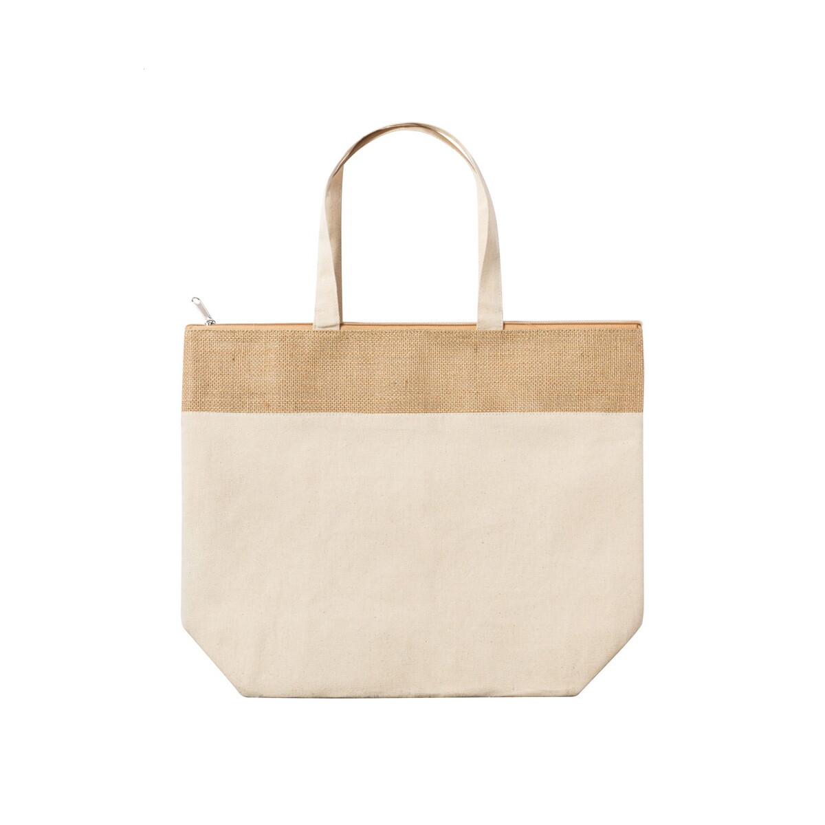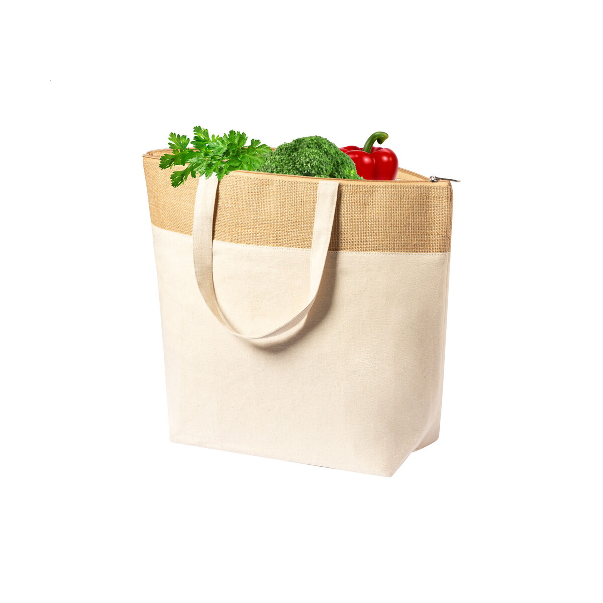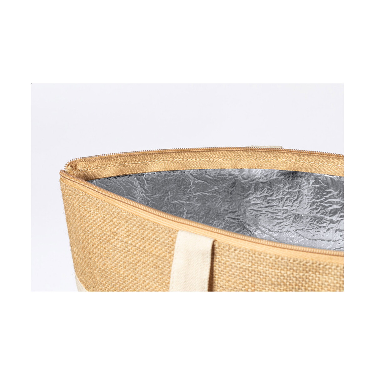 Wymiary torby to 330×430×140 mm, co przy wadze zaledwie 170 g czyni ją lekką, lecz pojemną. Solidny materiał – juta, bawełna i aluminium – gwarantuje trwałość, a płaskie dno ułatwia pakowanie nawet większych artykułów spożywczych. Model znakomicie wpisuje się w kategorie Torby termiczne z logo oraz Torby na zakupy z logo, oferując szeroką powierzchnię pod nadruk.