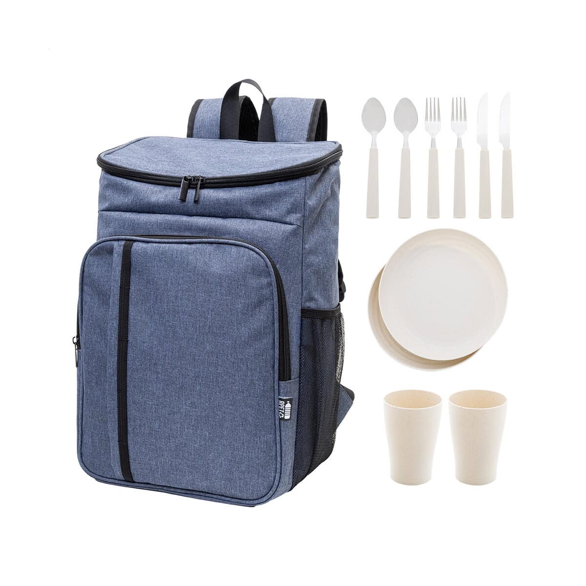 Wymiary: 270×440×190 mm, waga: 750 g – to kompaktowy, lecz pojemny format, który pomieści wszystko, co potrzebne na wspólne biesiadowanie w plenerze. Materiał: solidny 600D Poliester z recyklingu PET wzmocniony wyściółką PEVA zapewnia świetną izolację termiczną i łatwe czyszczenie, a sztućce z PP i stal nierdzewna dołączone do zestawu wystarczą dla dwóch osób. W komplecie znajdziesz 2 talerze, 2 kubki oraz komplet sztućców – doskonały zestaw, by od razu ruszyć w teren. Kolory: ciemnoniebieski, ciemnoszary – stonowane, eleganckie odcienie, które podkreślą charakter Twojej marki.