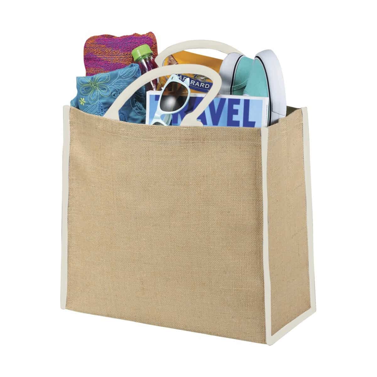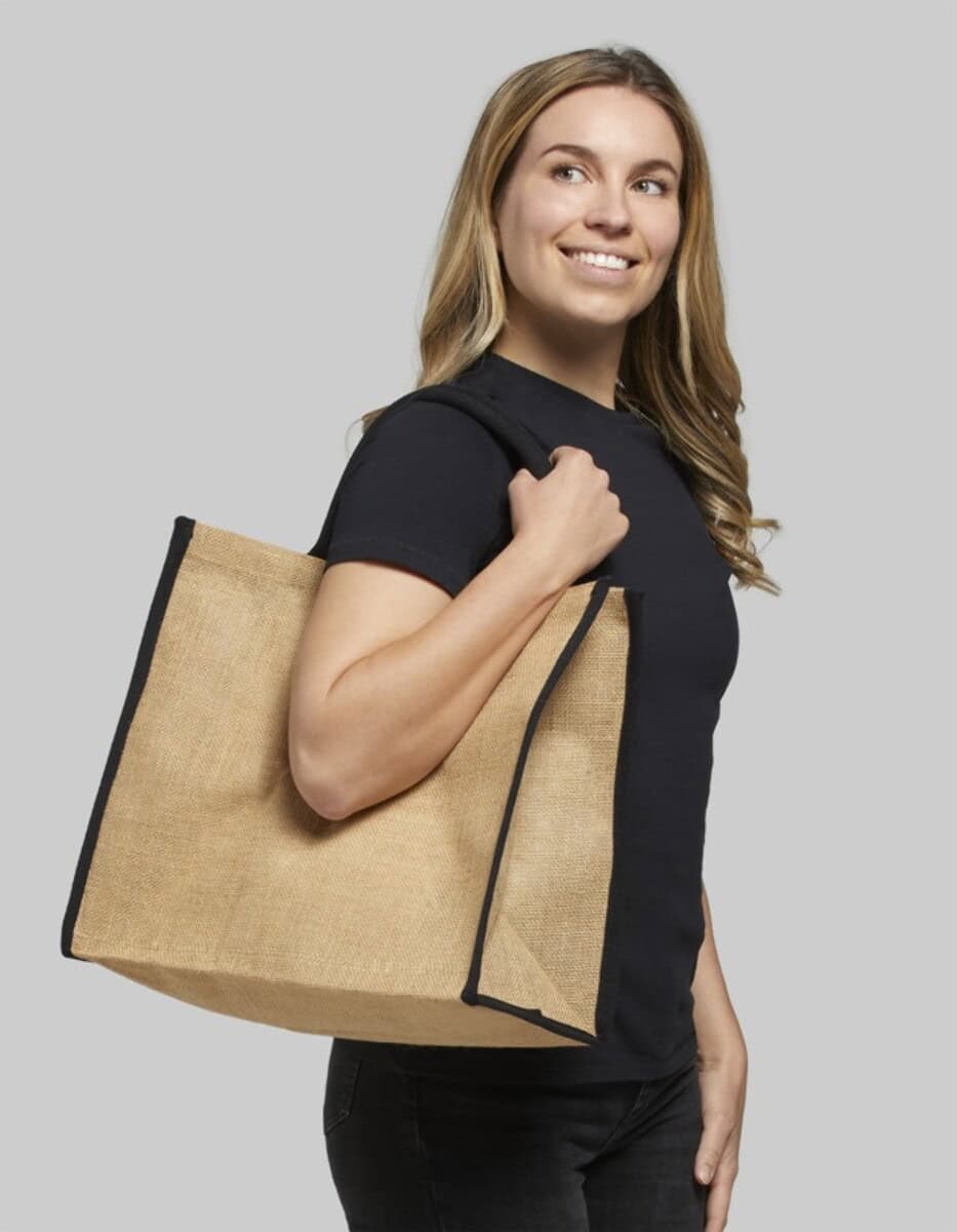 Dzięki szerokim ściankom z naturalnej tkaniny Duża torba jutowa idealnie prezentuje firmowy nadruk lub logo, czyniąc z niej znakomity nośnik przekazu reklamowego. Subtelny kolor „piasek pustyni” stanowi doskonałe tło dla intensywnych barw, a wyraziste, barwne krawędzie dodają elegancji. To sprawia, że torba świetnie sprawdzi się w branżach dbających o wizerunek eko, takich jak sklepy ze zdrową żywnością, salony kosmetyki naturalnej, producenty odzieży organicznej czy organizatorzy eventów prośrodowiskowych. W kategorii Torby na zakupy z logo oraz Torby bawełniane z logo wyróżnia się naturalnym pochodzeniem materiału oraz dużą powierzchnią znakowania.
