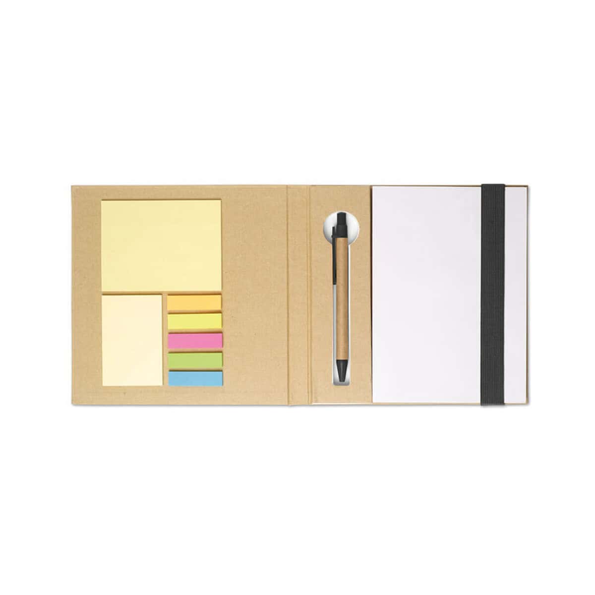 Eco Notes. QUINCY to prawdziwie ekologiczny gadżet, który pozwoli Ci wyróżnić się w świecie biznesu 🌿. W zgrabnym formacie 18,5 × 18 × 1,8 cm kryje się aż 100 arkuszy papieru z recyklingu, dzięki czemu możesz budować wizerunek odpowiedzialnej marki. Twarda kartonowa okładka chroni notatki, a elastyczne zamknięcie sprawia, że całość pozostaje zawsze schludna. W komplecie znajdziesz dopasowany długopis z papierową obsadką oraz praktyczny uchwyt, co czyni ten zestaw niezwykle wygodnym w codziennym użytkowaniu. Dodatkowo trzyczęściowy notatnik kryje duże i średnie żółte karteczki samoprzylepne oraz 5 markerów w różnych kolorach – idealne do szybkiego oznaczania priorytetów.