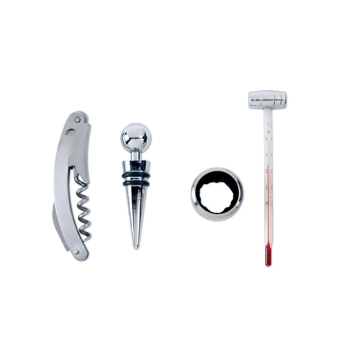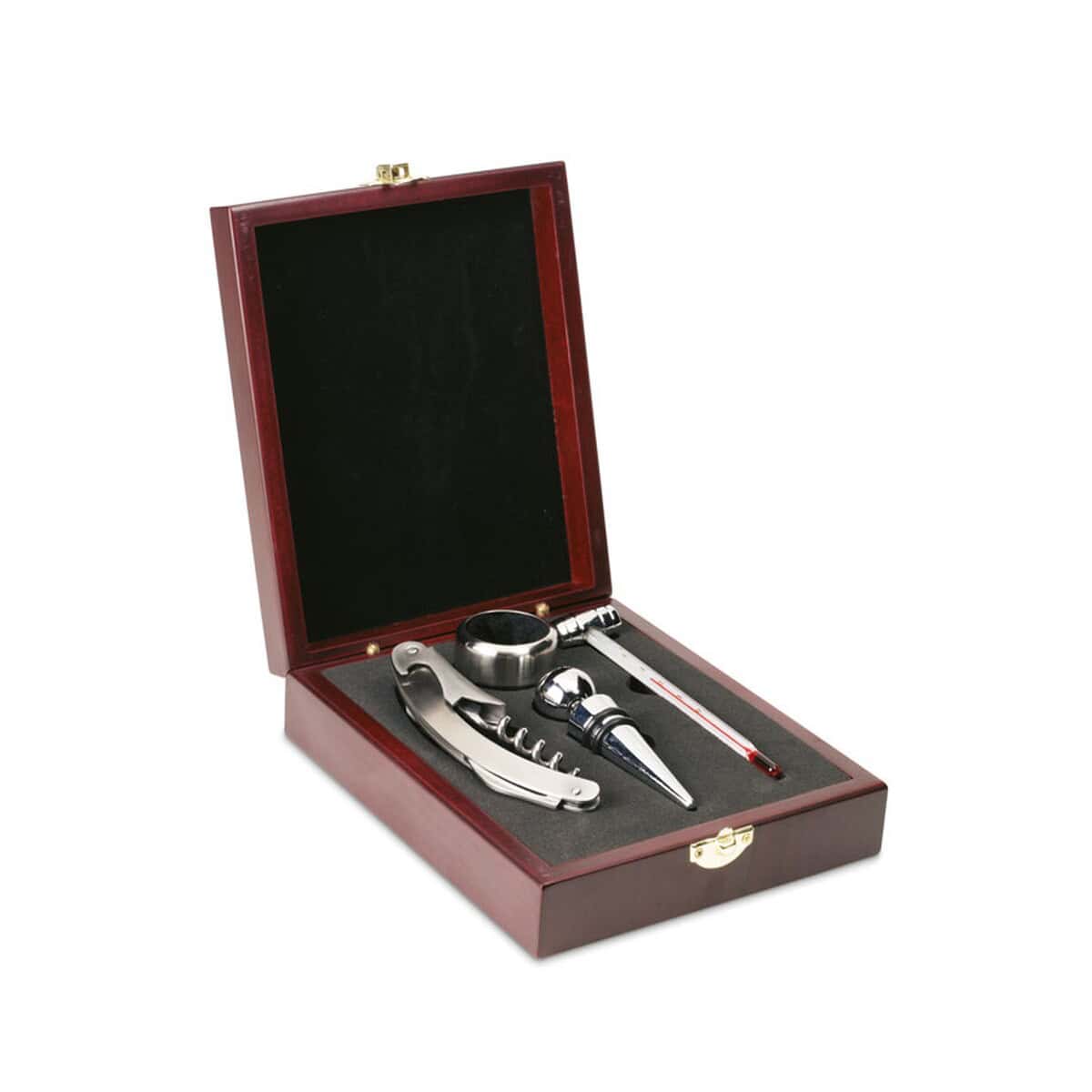 Elegancki komplet do wina PREMIUM to wyśmienity gadżet stworzony z myślą o koneserach wina oraz firmach, które chcą wyróżnić się eleganckim upominkiem reklamowym. Zamknięty w kunsztownym drewnianym pudełku o wymiarach 17,5 x 14,5 x 4,8 cm i wadze jedynie 0,580 kg, zachwyca nie tylko funkcjonalnością, ale także designerskim charakterem. Wewnątrz znajdziesz srebrny korkociąg, praktyczną zatyczkę, stylowy kołnierz zapobiegający kapaniu i precyzyjny termometr – pełen zestaw, który sprawi, że każde otwarcie butelki będzie małym rytuałem 🍷.