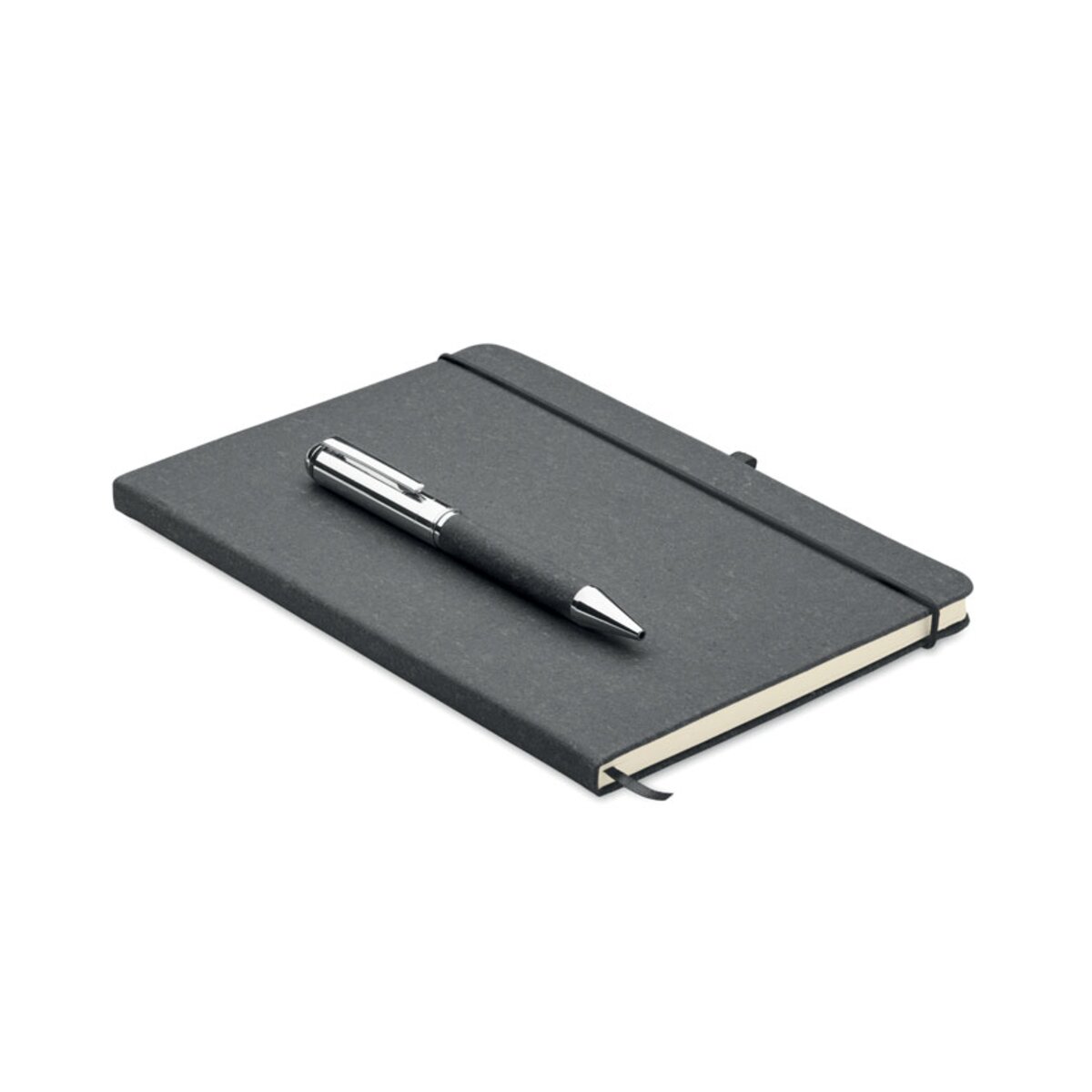 W skład zestawu wchodzi elegancki notatnik formatu A5 o twardych okładkach, wykonanych w 75% ze skóry z recyklingu. Takie podejście do produkcji czyni go doskonałym wyborem dla osób ceniących sobie ekologiczne rozwiązania. Notatnik składa się z 160 stron (80 kartek) papieru z recyklingu, które są linie, co ułatwia pisanie i porządkowanie notatek. Dodatkowo, notatnik jest wyposażony w dopasowaną gumkę zamykającą, elegancki wstążkowy znacznik stron oraz praktyczny uchwyt na długopis.