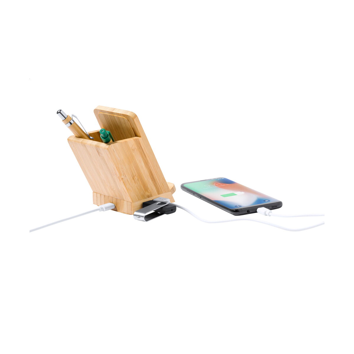 Eterna wielofunkcyjny stojak biurkowy/uchwyt na długopisy to gadżet, który łączy w sobie elegancję naturalnego materiału z wysoką funkcjonalnością nowoczesnego biura. Wykonany z ekologicznego bambusu, w kolorze naturalny, wpisuje się w trend zrównoważonego stylu pracy i przyciąga uwagę subtelnym designem 🌿. Jego zwarta forma o wymiarach 68×121×115 mm i masie zaledwie 600 g sprawia, że bez trudu zmieści się na każdym biurku, nie tracąc przy tym stabilności. Oprócz pojemnika na przybory, Eterna wielofunkcyjny stojak biurkowy/uchwyt na długopisy oferuje wbudowaną ładowarkę indukcyjną 5 W, poręczny uchwyt na smartfon oraz 4-portowy hub USB 2.0. Dzięki temu wszystkie niezbędne akcesoria masz zawsze pod ręką 😊.