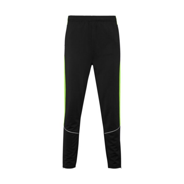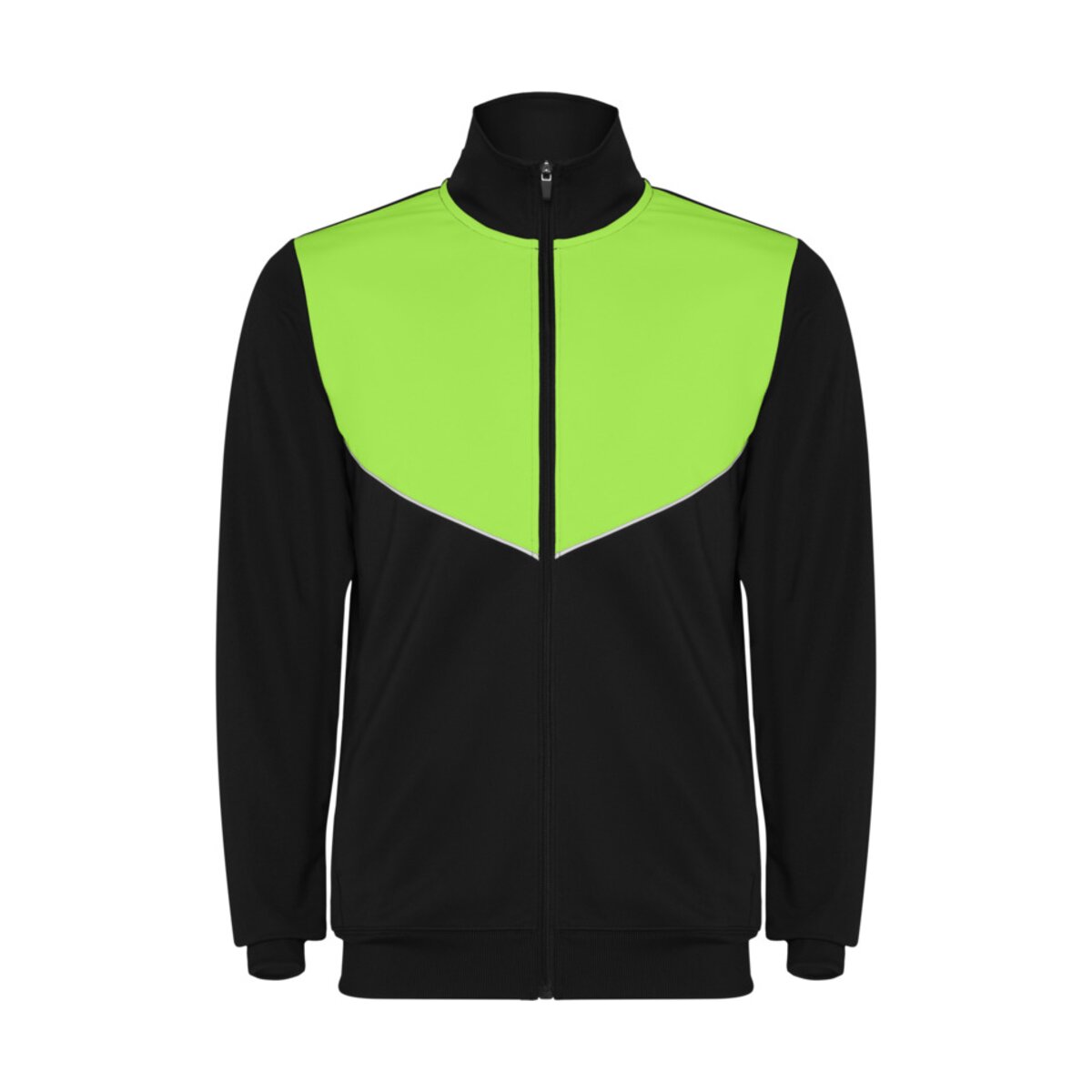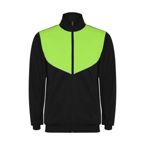 Dres z lekkiego i elastycznego materiału. Kurtka w kontrastowym kolorze z przeszyciami na klatce piersiowej. Wysoki kołnierz z kontrastowymi szwami. Zamek błyskawiczny z przodu na środku. Boczne kieszenie. Mankiety i talia wykończone ściągaczem 2×2. Spodnie z gumką w pasie i sznurkiem. Kontrastująca część z boku nogawki wykończona lamówką. Zamek błyskawiczny na dole nogawek.