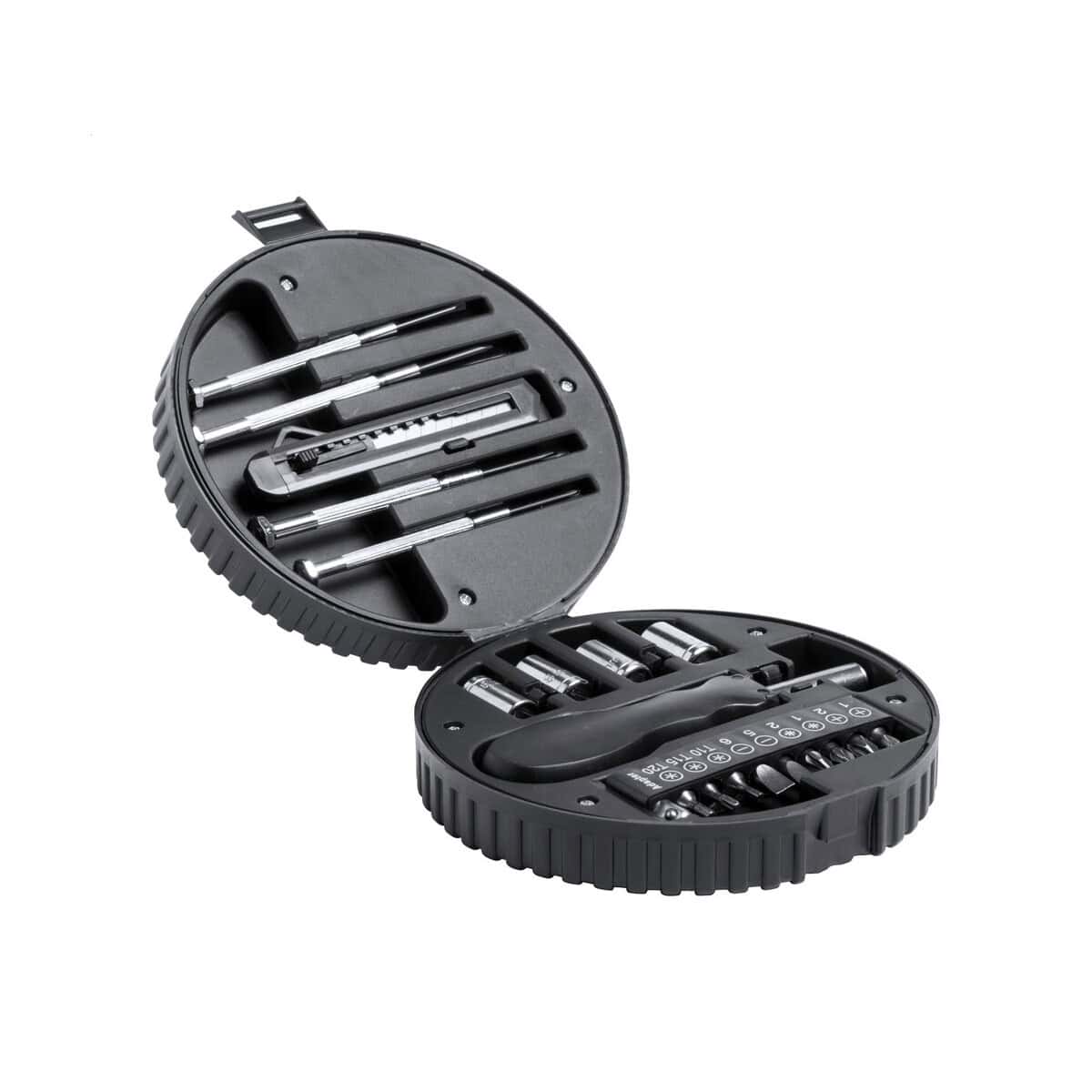 Fangio zestaw narzędzi to prawdziwie uniwersalny gadżet, który wzbudza zachwyt nie tylko miłośników motoryzacji. 20-elementowy komplet został sprytnie zamknięty w plastikowym etui w kształcie koła samochodowego, dzięki czemu na pierwszy rzut oka przyciąga uwagę i skutecznie eksponuje firmowe logo 😊. Wymiary etui to zaledwie ø128×48 mm, a waga 395 g, co sprawia, że całość jest lekka i poręczna – bez trudu zmieści się w schowku auta, w biurowej szufladzie czy w plecaku serwisanta. Wykonanie z trwałego tworzywa ABS w eleganckiej czerni podkreśla profesjonalny charakter produktu, jednocześnie chroniąc narzędzia przed uszkodzeniami. Każdy z elementów – od precyzyjnych śrubokrętów po bity i klucz nasadkowy – został starannie dobrany tak, aby zapewnić szybkie i skuteczne naprawy w każdej sytuacji.