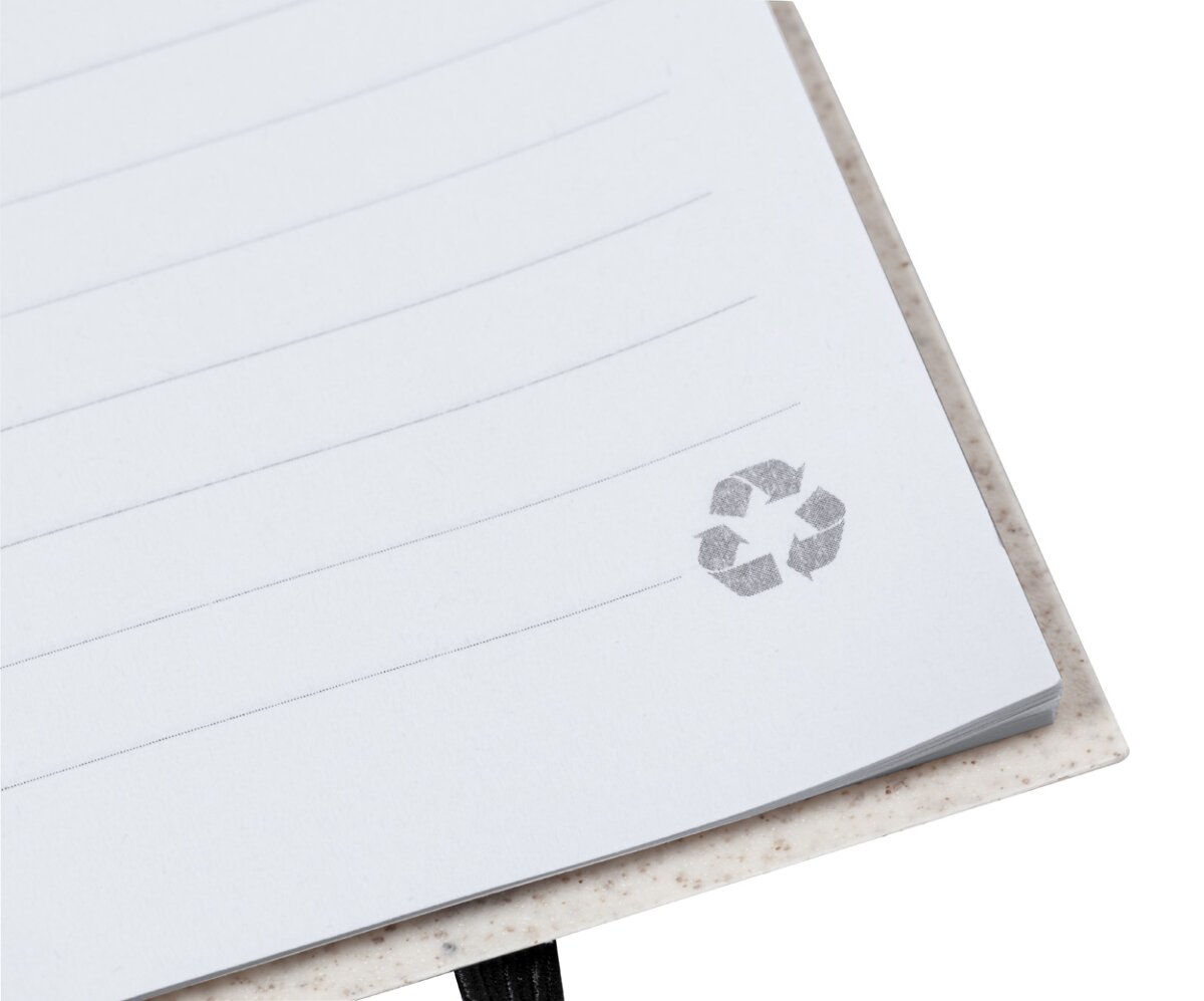 Notes A6 zawiera 70 kartek w linie, które zostały wytworzone z papieru z recyklingu. W zestawie znajduje się również długopis, który posiada wkład w kolorze niebieskim, idealny do pisania na każdego rodzaju papierze. Gumka do zamykania notesu zapewnia, że żadne ważne informacje przypadkowo się nie zgubią.