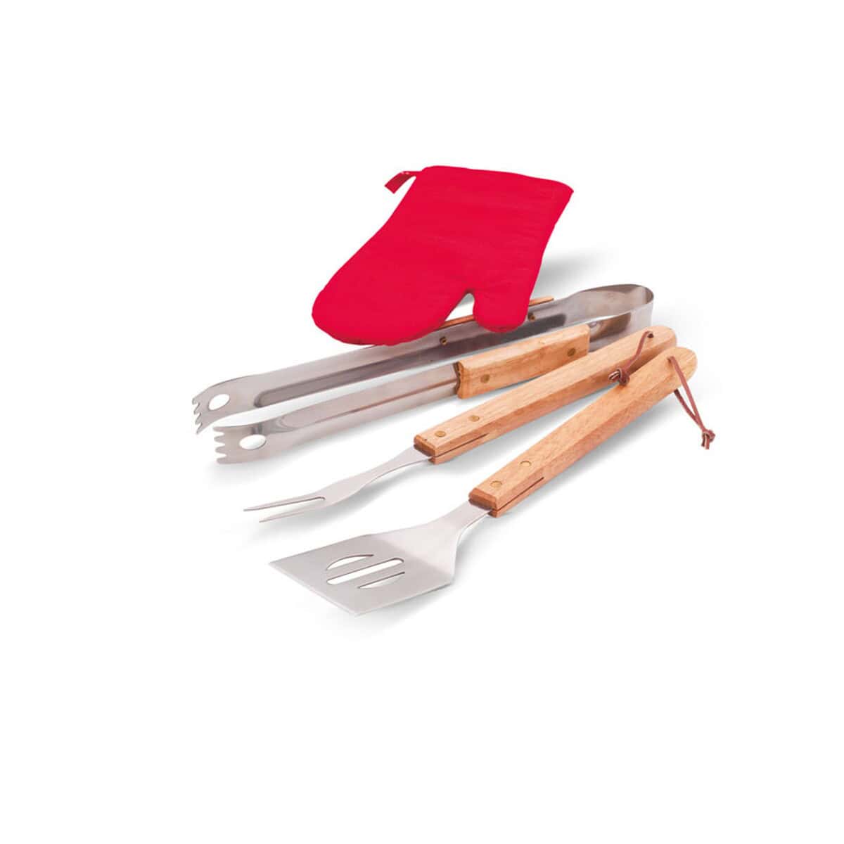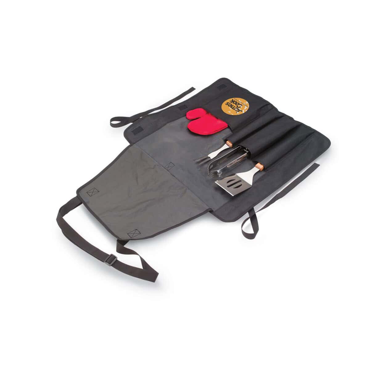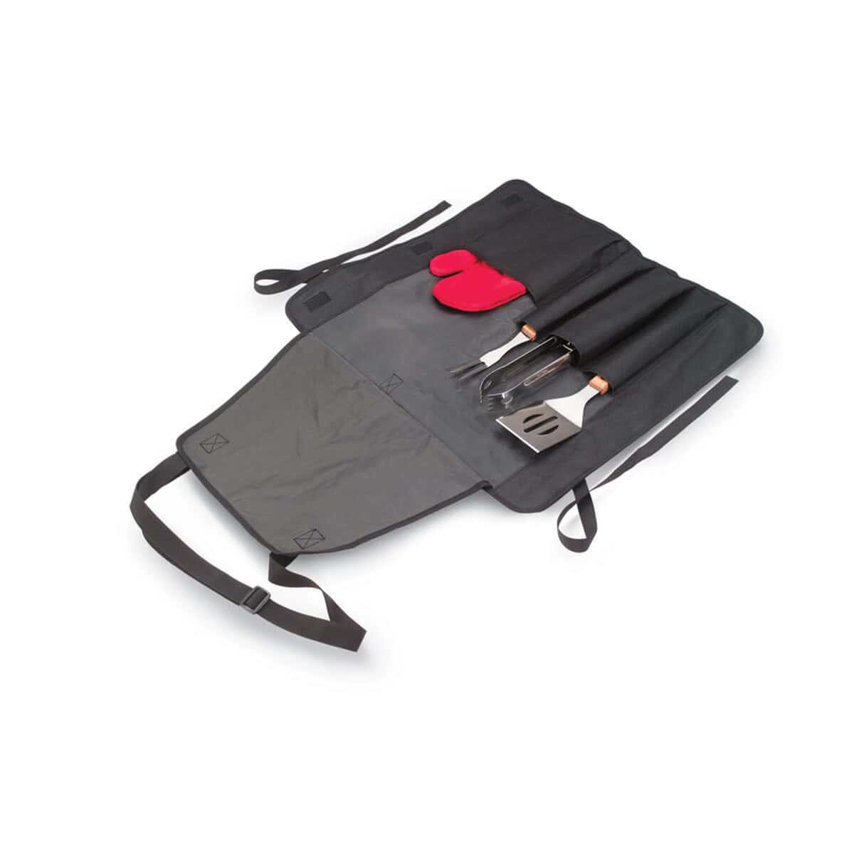 W komplecie znajduje się aż trzy narzędzia do grilla – szczypce, łopatka i widelec – oraz praktyczna rękawica, wszystkie dyskretnie mocowane w specjalnych kieszeniach. Całość ma kompaktowe wymiary 74x50x2 cm przy niewielkiej wadze 0,674 kg, co ułatwia zarówno przechowywanie, jak i transport. Dzięki temu gadżet sprawdzi się nie tylko w ogrodzie, ale też na pikniku czy firmowym evencie.