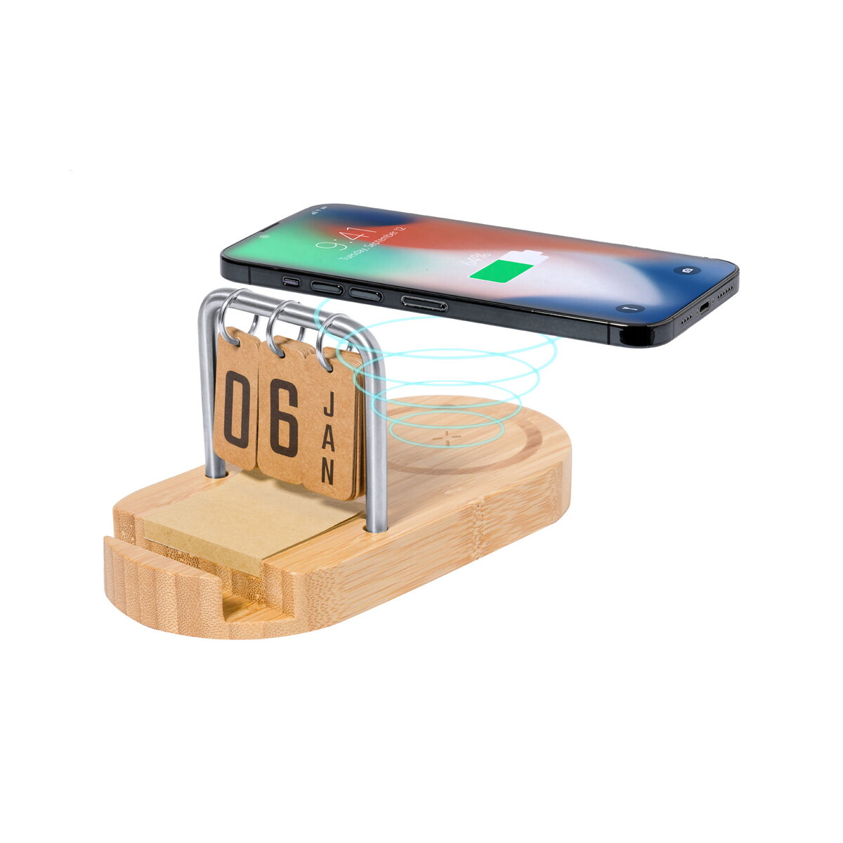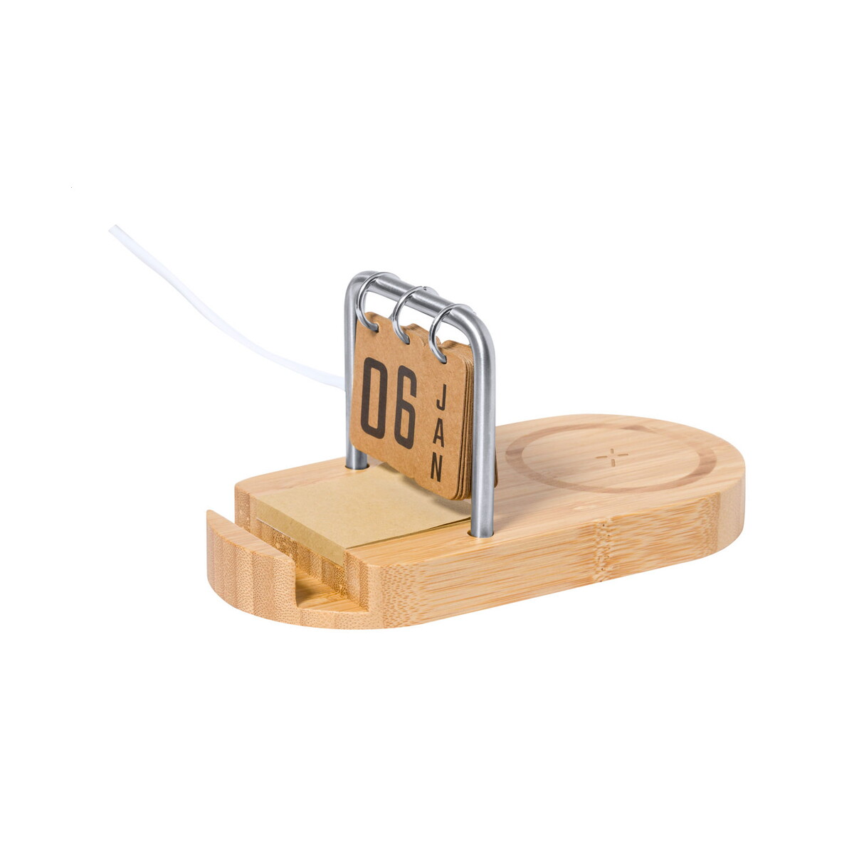 Faylo wielofunkcyjna ładowarka indukcyjna to znakomity wybór dla marek, które chcą połączyć ekologiczny styl z najnowszą technologią 📱. Wykonana z naturalnego bambusu i osadzona na eleganckiej metalowej ramie, natychmiast przyciąga wzrok, a miejsce na logo pozwala zamienić ją w efektowny gadżet reklamowy. Ten produkt łączy aż trzy funkcje: szybkie ładowanie indukcyjne 15 W, stabilny uchwyt na telefon oraz wieczny kalendarz, dzięki czemu stanowi perfekcyjne centrum organizacyjne na każdym biurku. Dodatkowo w zestawie znajdują się porty USB i USB-C, kabel do ładowania oraz 50 kraftowych karteczek samoprzylepnych, które sprawdzą się podczas notowania pomysłów w biegu 🙂.
