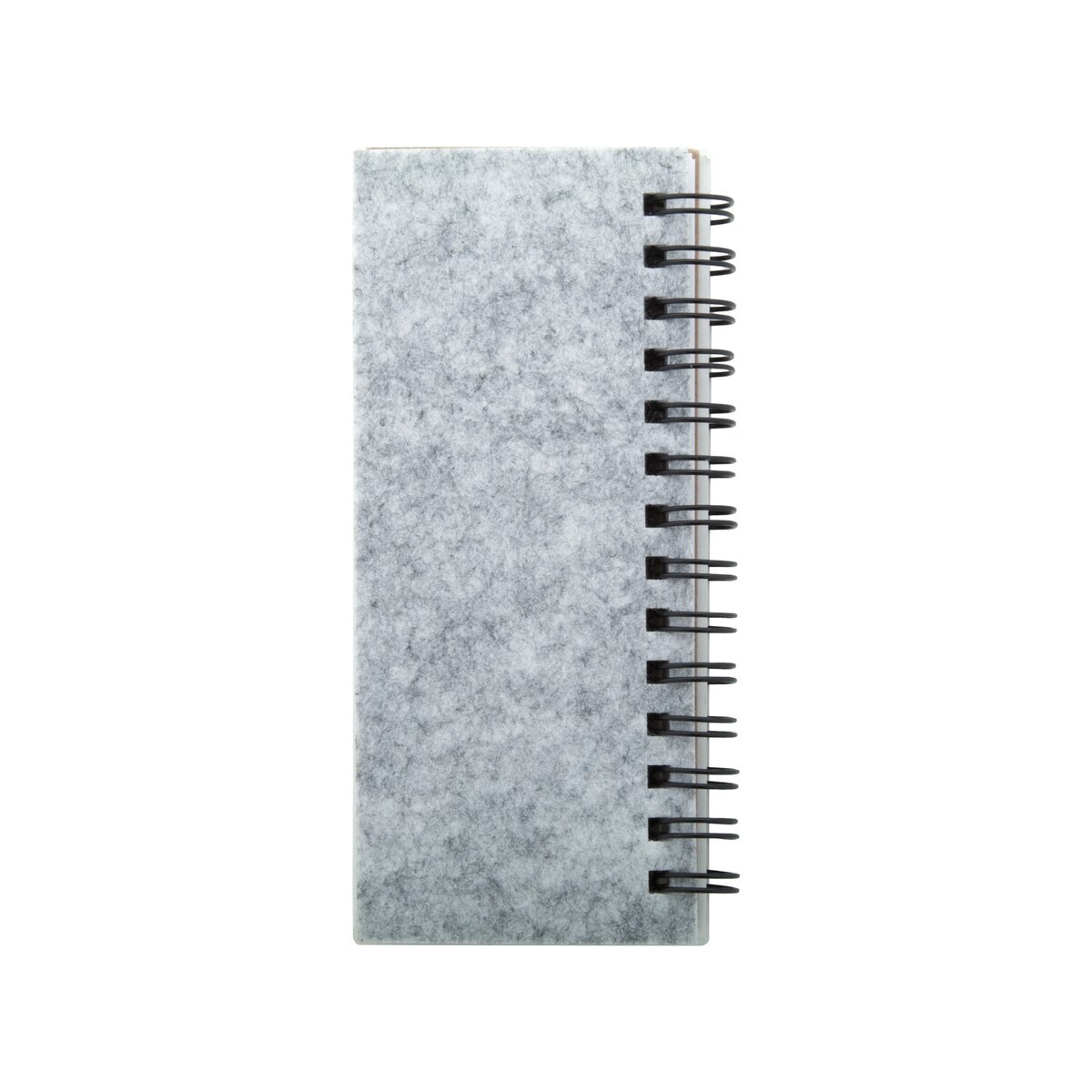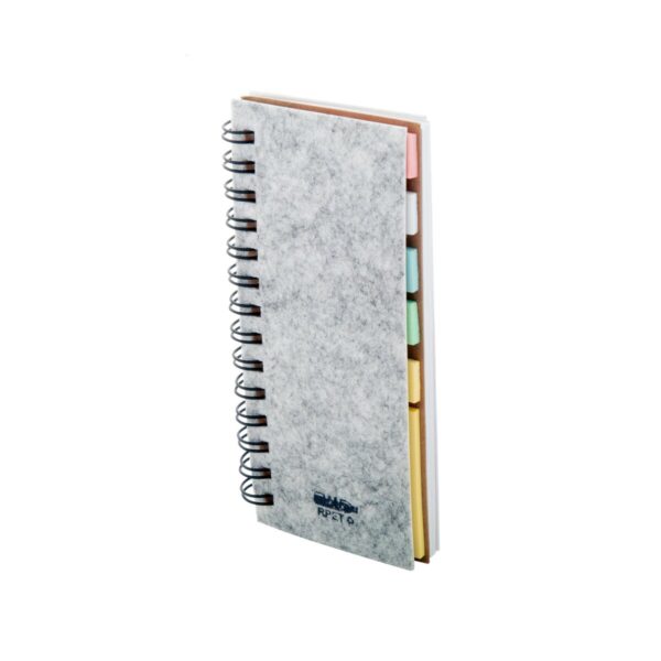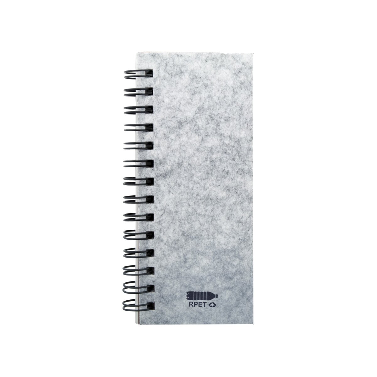 Poznaj Felmark RPET notes RPET – niezbędnik każdego ekologicznego biura, który połączy funkcjonalność z troską o środowisko. Ten spiralny notes pokryty jest stylowym, szarym filcem, który nadaje mu elegancji oraz odporności na codzienne użytkowanie. W środku znajdziesz 40 kartek w linie wykonanych z papieru z recyklingu, idealnych do zapisywania notatek czy rysowania szkiców.