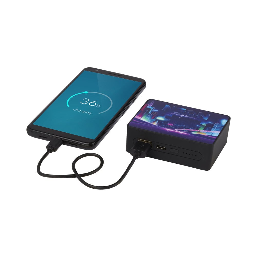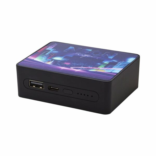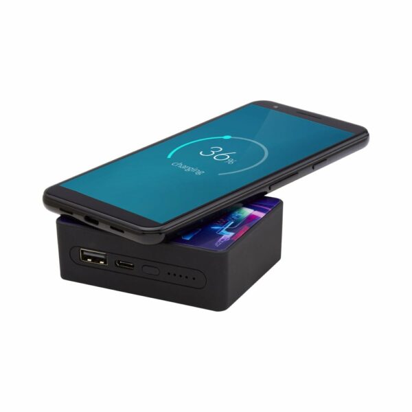 Ten wyjątkowy bezprzewodowy powerbank o pojemności 10 000 mAh zapewnia szybkie i bezpieczne ładowanie. Pokryty hartowanym szkłem i nadającym się do indywidualnego zdobienia, powerbank jest kompatybilny ze wszystkimi urządzeniami obsługującymi standard QI, takimi jak urządzenia Android najnowszej generacji oraz iPhone 8 i wyżej. Wyposażony w wskaźnik zasilania, który przez cały czas pokazuje poziom energii, powerbank ma wejście typu C 5 V / 2 A, wyjście USB-A 5 V / 2 A oraz wyjście bezprzewodowe 5 V / 1 A 5 W. Wykonany z tworzywa ABS z gumową powłoką i hartowanym szkłem z przodu, sprzedawany jest w zestawie z wolnym od PVC kablem ładującym typu C z tworzywa sztucznego TPE. Zestaw zapakowany jest w ozdobnym pudełku upominkowym.