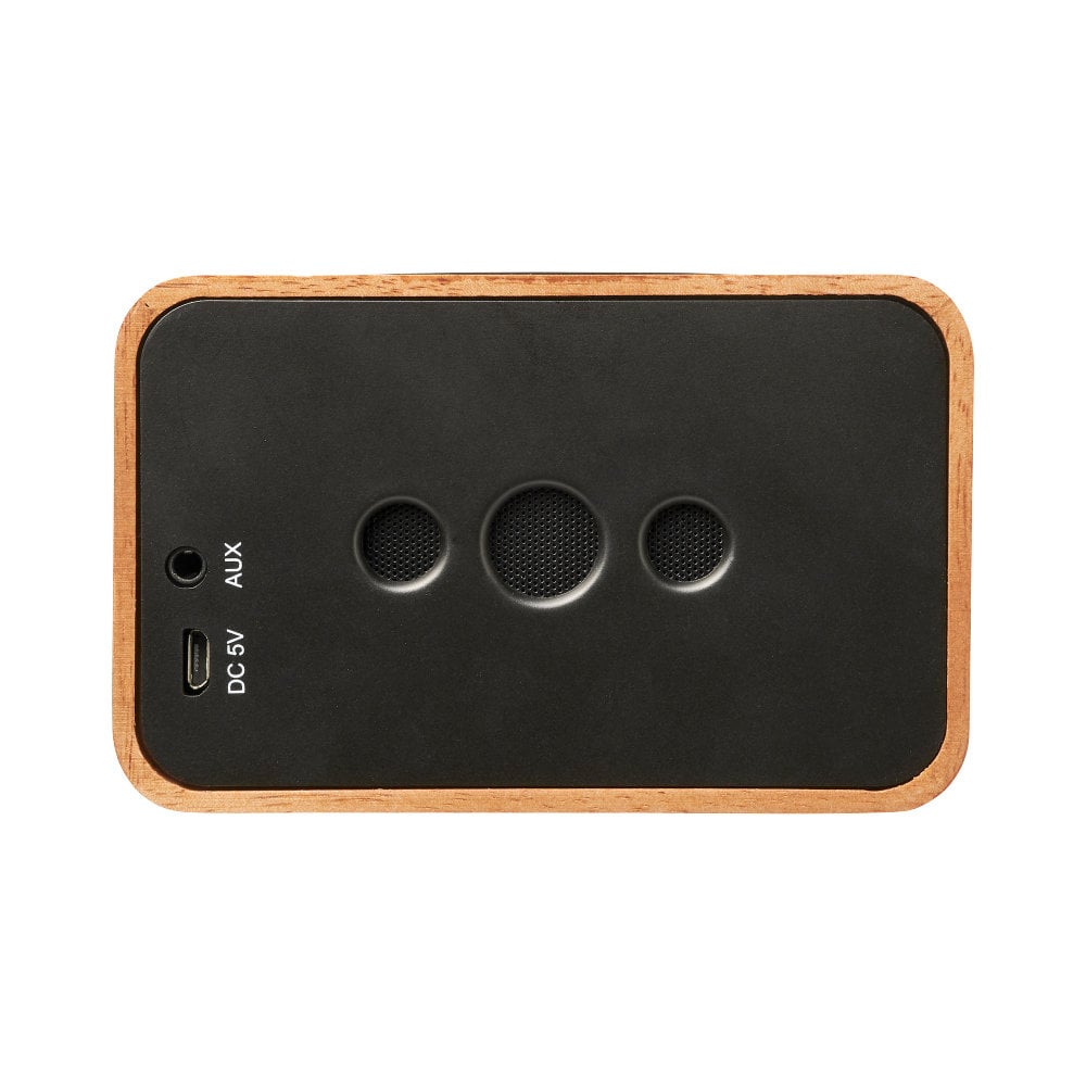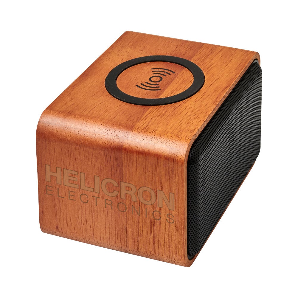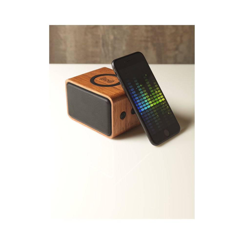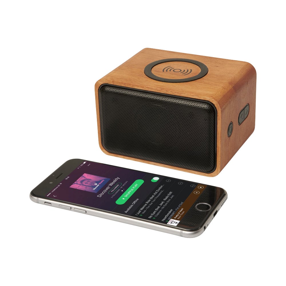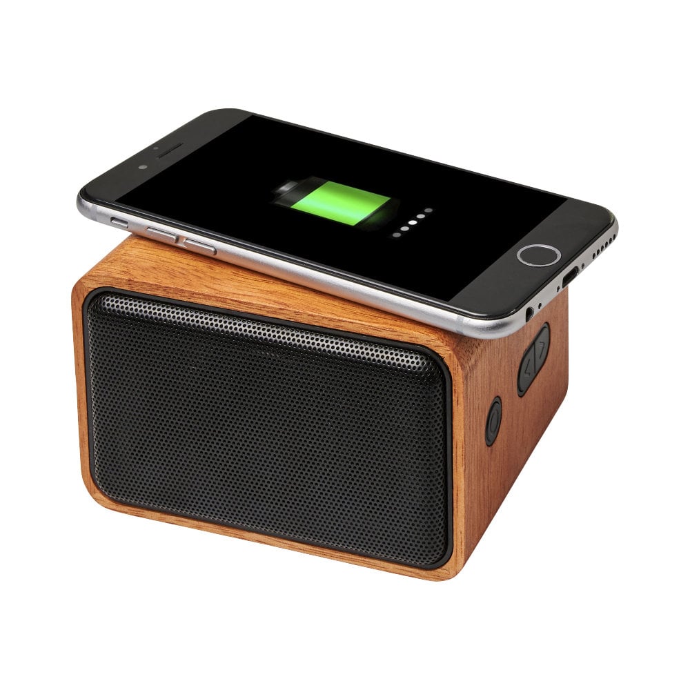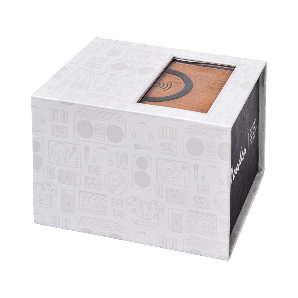 Głośnik Wooden to jeden z najwyższej jakości produktów korzystających z technologii Bluetooth®. Jego moc 3 W zapewnia czysty i dopracowany dźwięk. Użytkownikom oferuje on także bezprzewodową ładowarkę indukcyjną, która pozwala na ładowanie wszelkich urządzeń kompatybilnych z funkcją ładowania indukcyjnego. Głośnik Wooden posiada także wbudowaną baterię o pojemności 1200 mAh, która pozwala na odtwarzanie muzyki przez ponad 6 godzin. Do jego cech należy także sterowanie głosem i mikrofon, a zasięg Bluetooth® wynosi aż 10 metrów (33 stopy). Dodatkowym atutem jest wykonanie z prawdziwego drewna i sprzedaż w ekskluzywnym pudełku upominkowym Avenue.