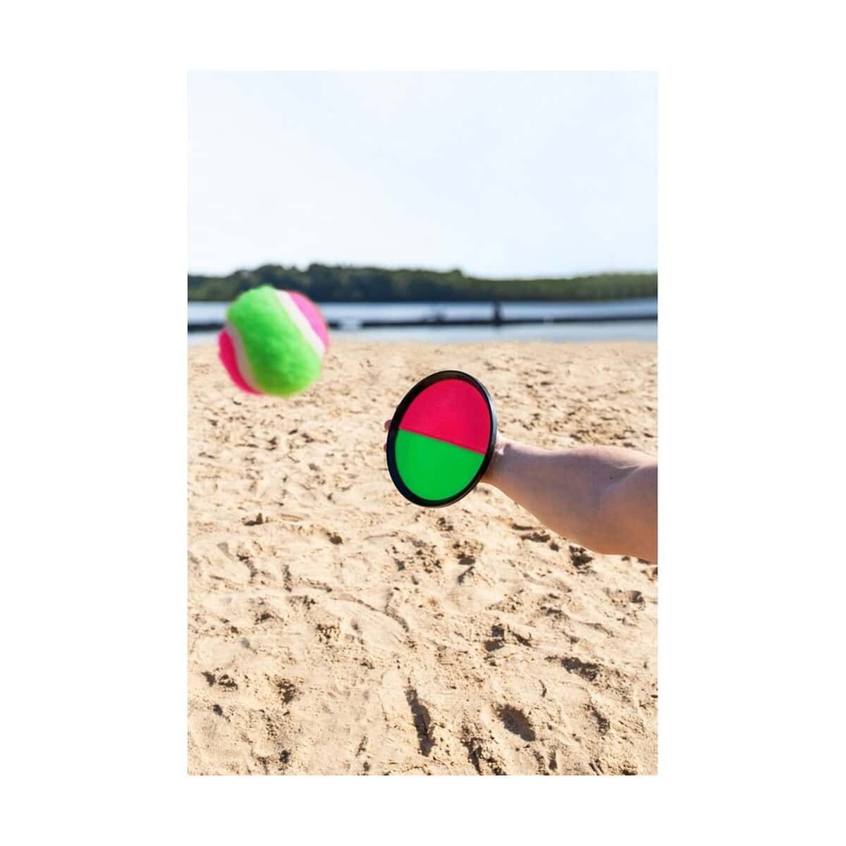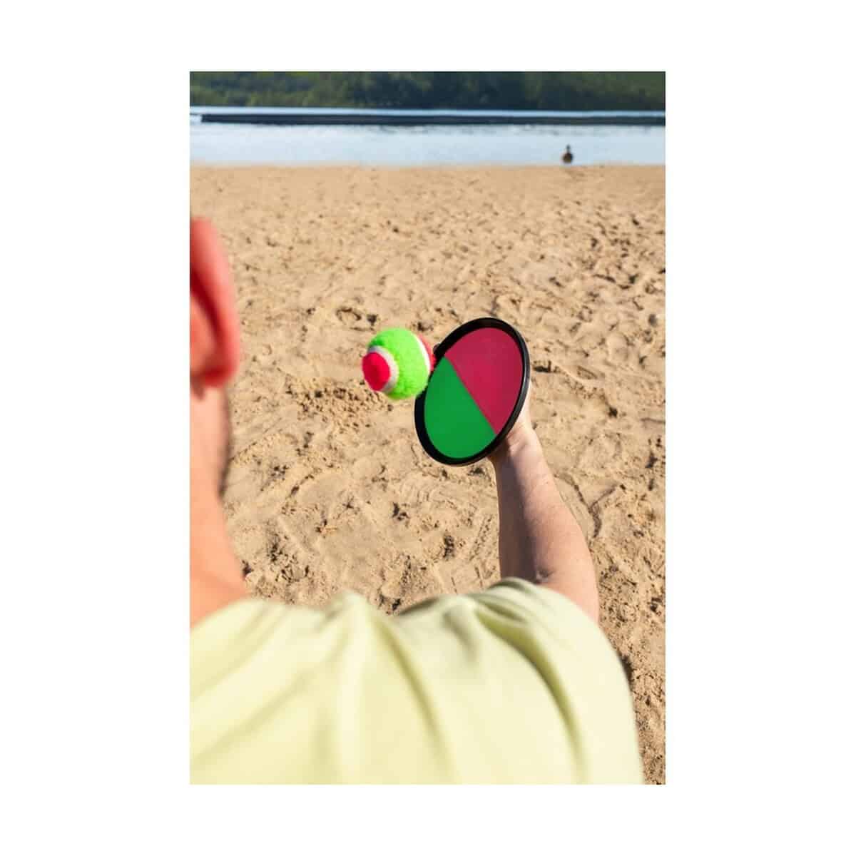 Gra zręcznościowa | Esther to energiczna, pełna ruchu propozycja z kategorii gry plażowe z logo, która przyciągnie uwagę zarówno dzieci, jak i dorosłych 😎. Zestaw składa się z dwóch paletek wyposażonych w rzepy oraz jednej piłki, co pozwala bawić się praktycznie w każdym miejscu – na plaży, w parku, na pikniku czy podczas firmowego pikniku integracyjnego. Dzięki średnicy Ø18 x 2 cm i wadze zaledwie 200 g zestaw jest lekki, więc bez problemu zmieści się w plecaku lub torbie plażowej. Wytrzymały materiał pp oraz uniwersalny czarny kolor sprawiają, że produkt prezentuje się elegancko, a zarazem jest odporny na uszkodzenia.