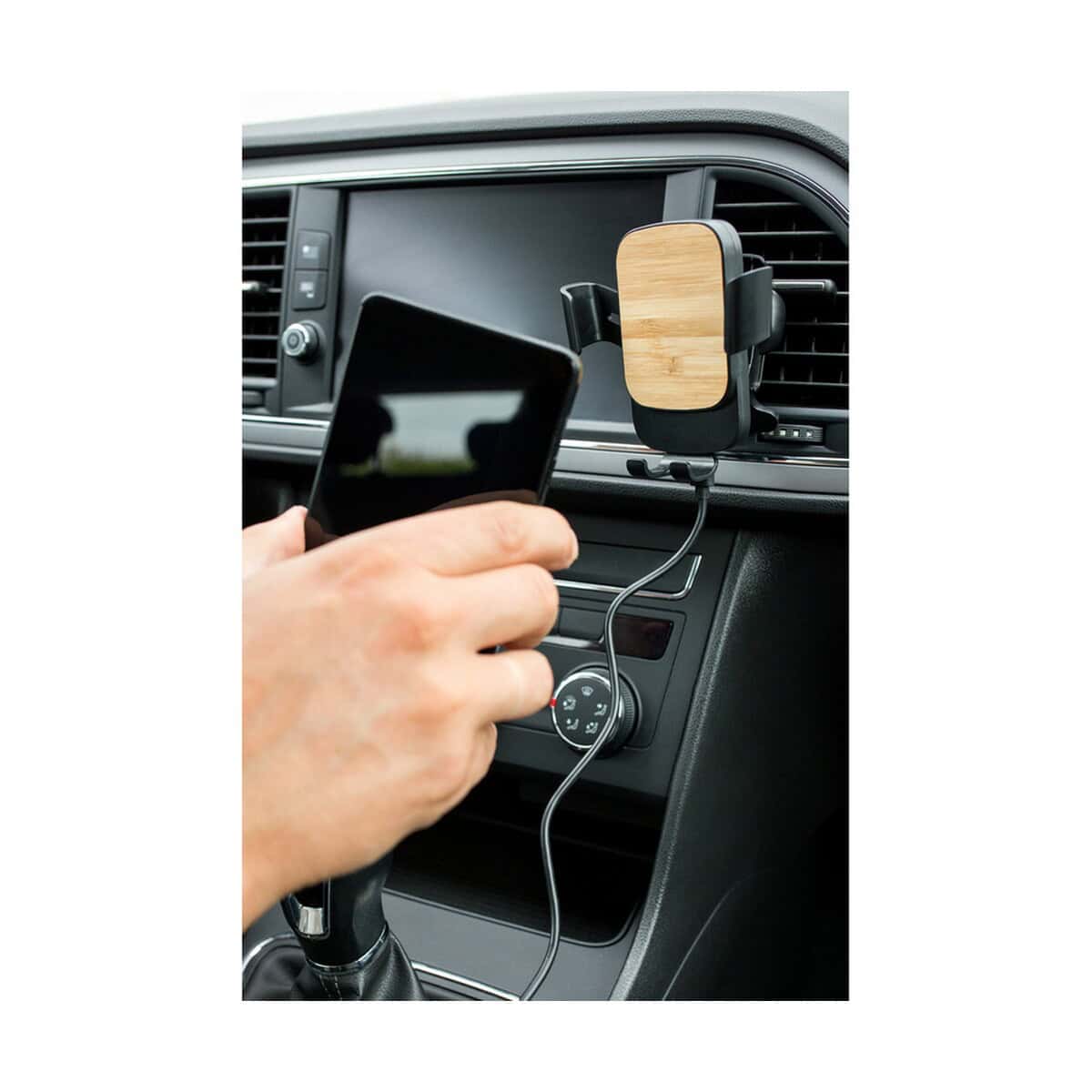 Grawitacyjny samochodowy uchwyt do telefonu, ładowarka bezprzewodowa 15W | Amberle to perfekcyjne połączenie elegancji bambusa z nowoczesną technologią indukcyjnego ładowania. Dzięki inteligentnemu mechanizmowi grawitacyjnemu wystarczy włożyć smartfon, a ramiona automatycznie dopasują się do jego szerokości, stabilnie utrzymując urządzenie nawet na wyboistej drodze 🚗. Wbudowana cewka 15 W gwarantuje szybkie uzupełnienie energii w telefonach obsługujących standard Qi, a dołączony przewód USB-C o długości 100 cm pozwala na wygodne podłączenie uchwytu do gniazda w aucie.