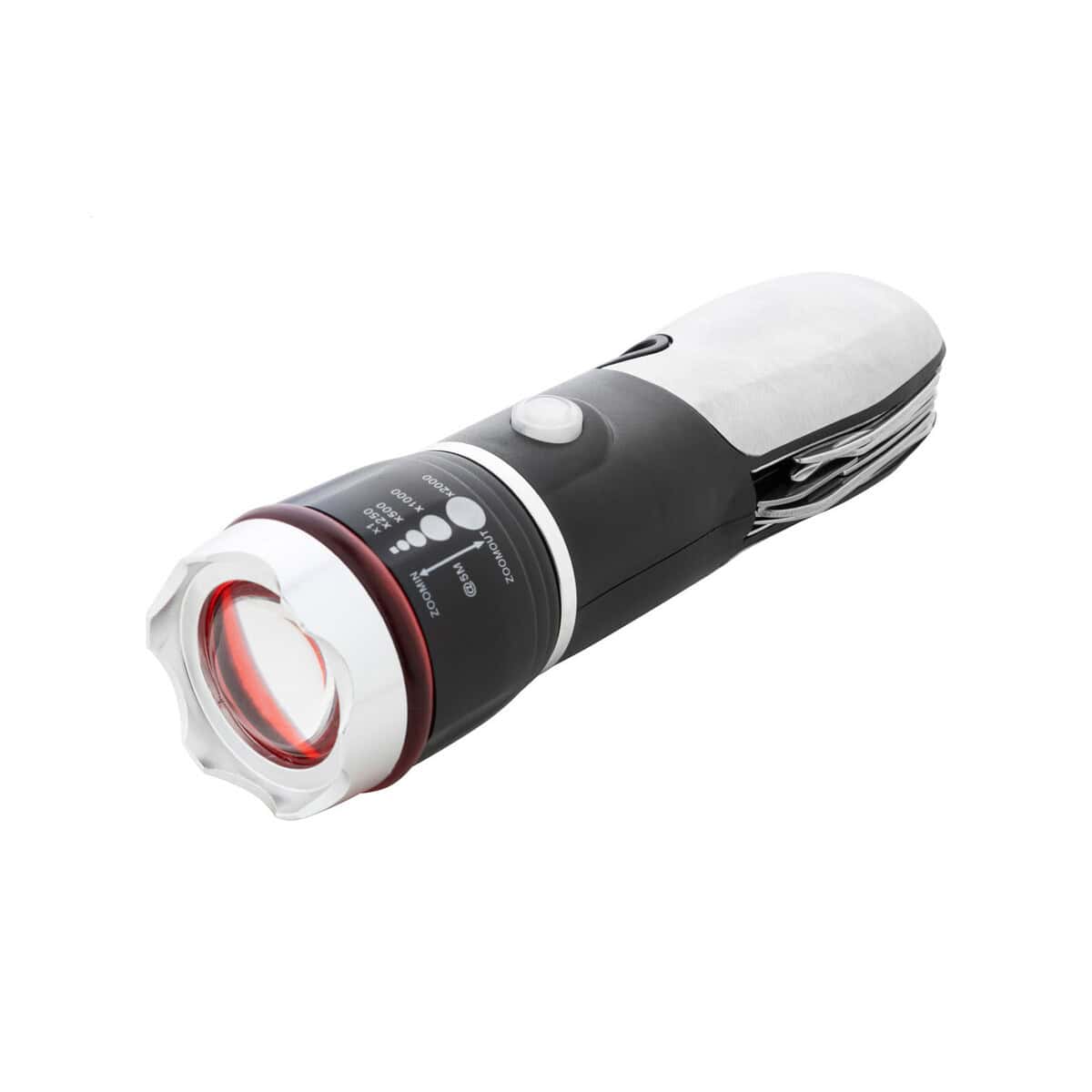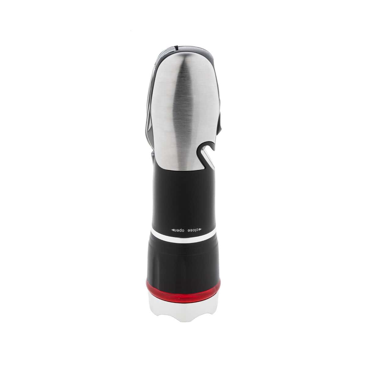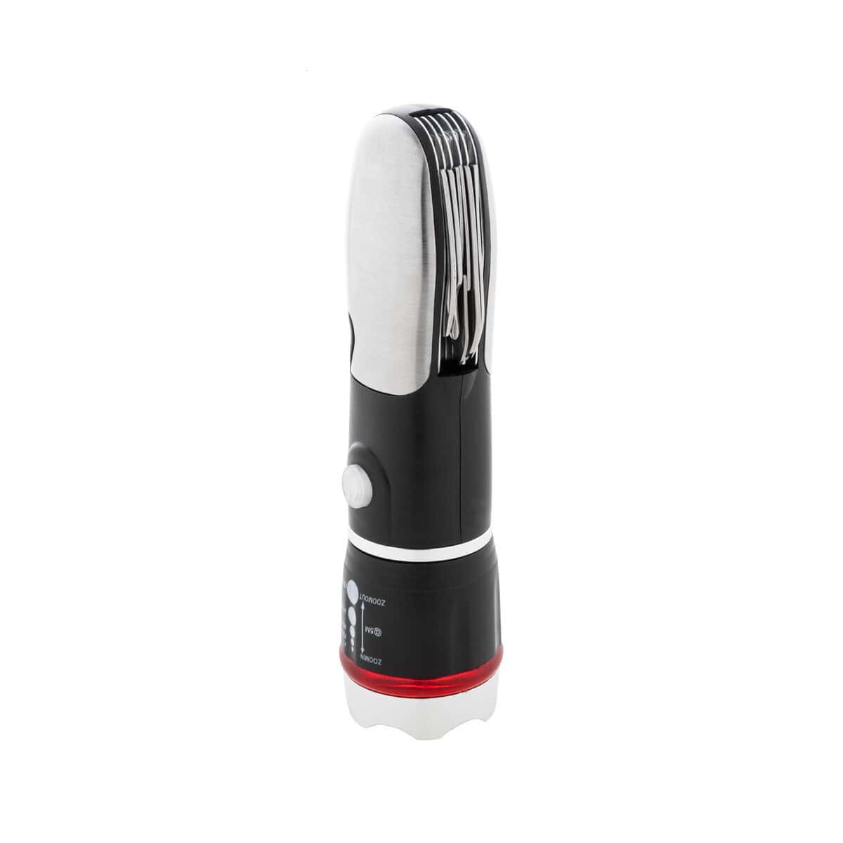 Wbudowana dioda LED z zoomem oferuje trzy tryby świecenia – mocny, ekonomiczny i stroboskopowy – co czyni latarkę świetnym wsparciem w warsztacie, na biwaku czy podczas służbowych inspekcji. W sytuacjach kryzysowych przydadzą się dodatkowe funkcje: młotek awaryjny do wybicia szyby, przecinak pasów bezpieczeństwa oraz ukryte narzędzie z 9 funkcjami, m.in. śrubokrętem i nożem. Zasilanie na trzy baterie AAA (łatwo dostępne w każdym sklepie) gwarantuje niezależność od sieci elektrycznej.