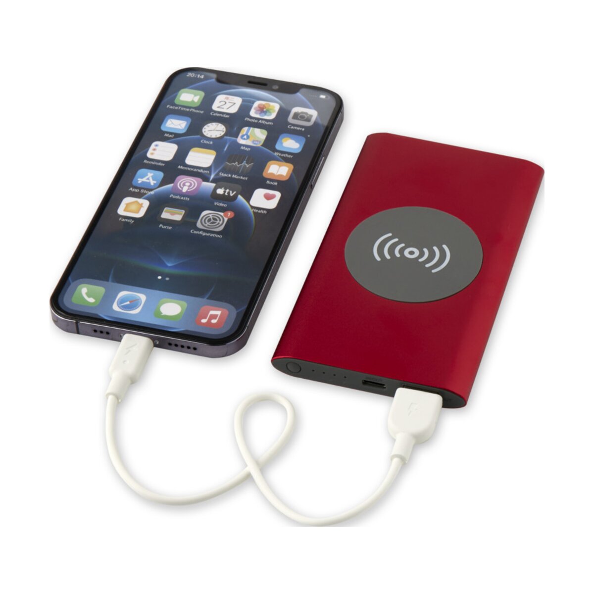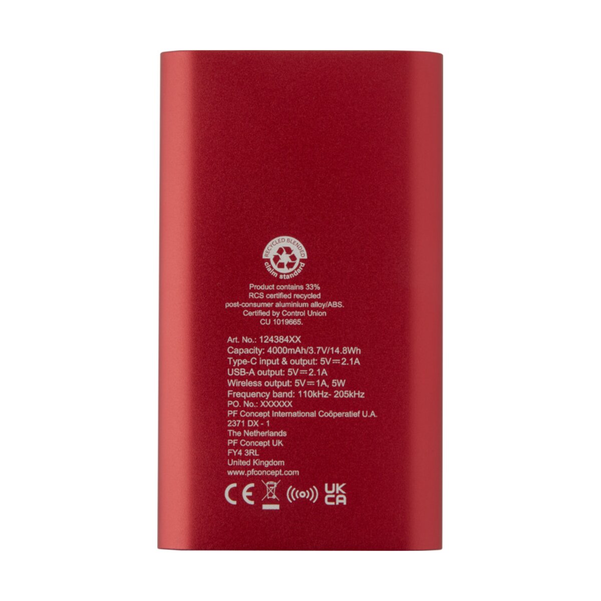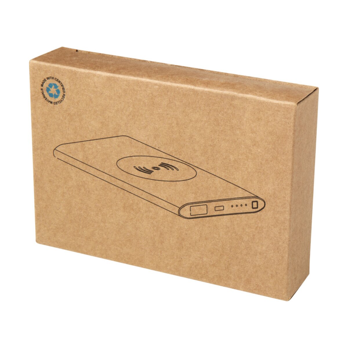 Power bank z portem wejścia/wyjścia typu C i portem USB-A, co oznacza, że można ładować 2 urządzenia jednocześnie. Nadaje się także do bezprzewodowego ładowania o mocy 5 W dla wszystkich urządzeń obsługujących Qi. Powerbank wyposażony jest w akumulator litowo-polimerowy o pojemności 4000 mAh, który zapewnia całkowitą moc wyjściową wynoszącą maks. 10 W. Ten powerbank jest wykonany w 28% z tworzyw sztucznych pochodzących z recyklingu z certyfikatem RCS. Dostarczany z kablem ładującym TPE typu C na USB-A.
