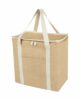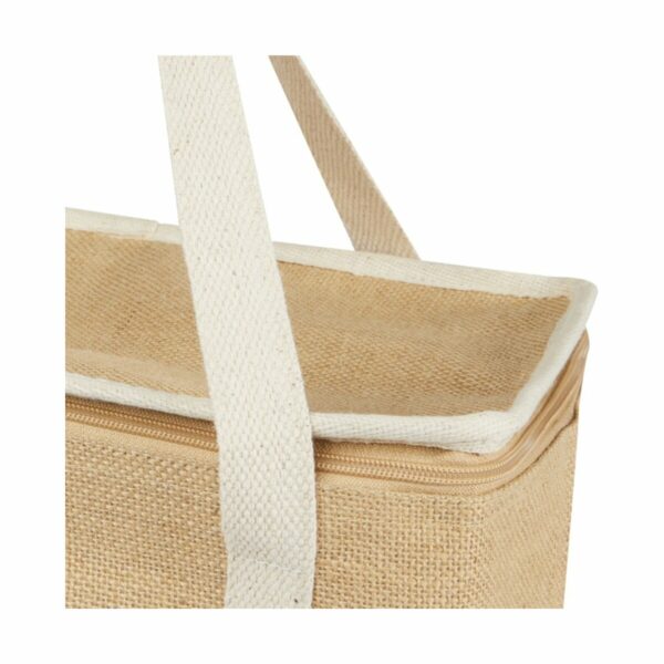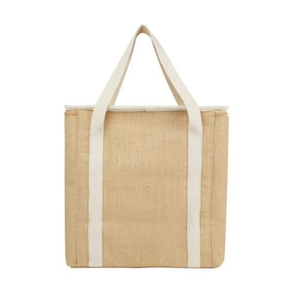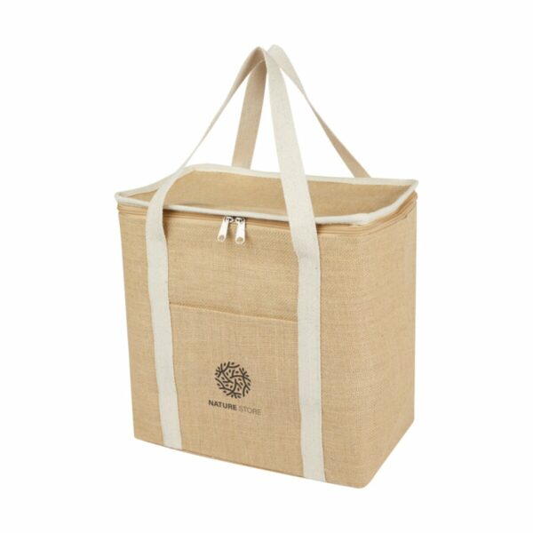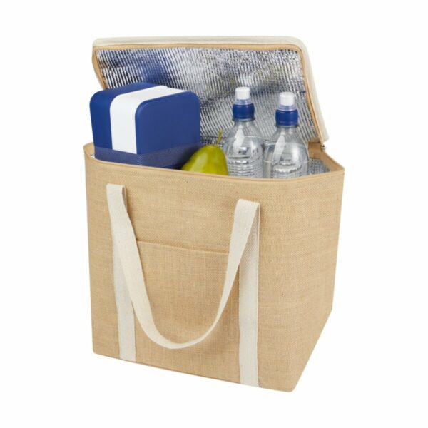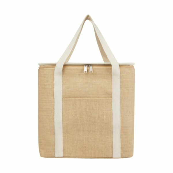 Duża torba termoizolacyjna Juta wykonana z wytrzymałej i odpornej na zużycie laminowanej juty. Posiada dużą (19 litrową) komorę główną, która może pomieścić sześć 1,5-litrowych butelek, wyłożoną wyjątkowo grubą i bezpieczną dla żywności izolacją aluminiową, która utrzymuje napoje, artykuły spożywcze i przekąski w niskiej temperaturze, suche i chronione przez wiele godzin. Torba ma górne zapięcie na suwak, przednią kieszeń i 2 bawełniane tkane uchwyty (50 x 2,5 cm). Wyprodukowano w Indiach z certyfikatem OEKO-TEX®.