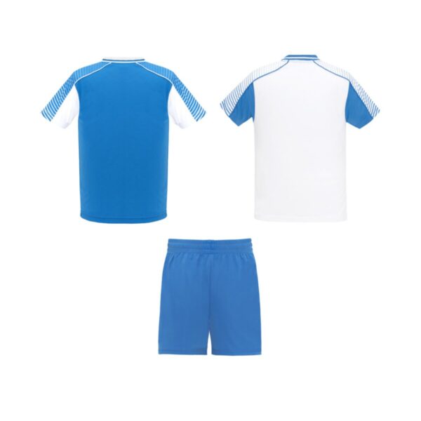 Zestaw składa się z 2 koszulek i 1 pary spodenek. Kolorystyka drugiej koszulki została zaprojektowana odwrotnie niż pierwszej. Techniczny i oddychający materiał. T-shirty z półraglanowymi rękawami z nadrukiem. Okrągły dekolt z trykotem na plecach. Elastyczny pas w spodenkach z dopasowanym wewnętrznym sznurkiem z zabezpieczającymi szwami. Spodenki z kontrastowym paskiem po bokach i rozcięciami u dołu. Usuwalna etykieta.