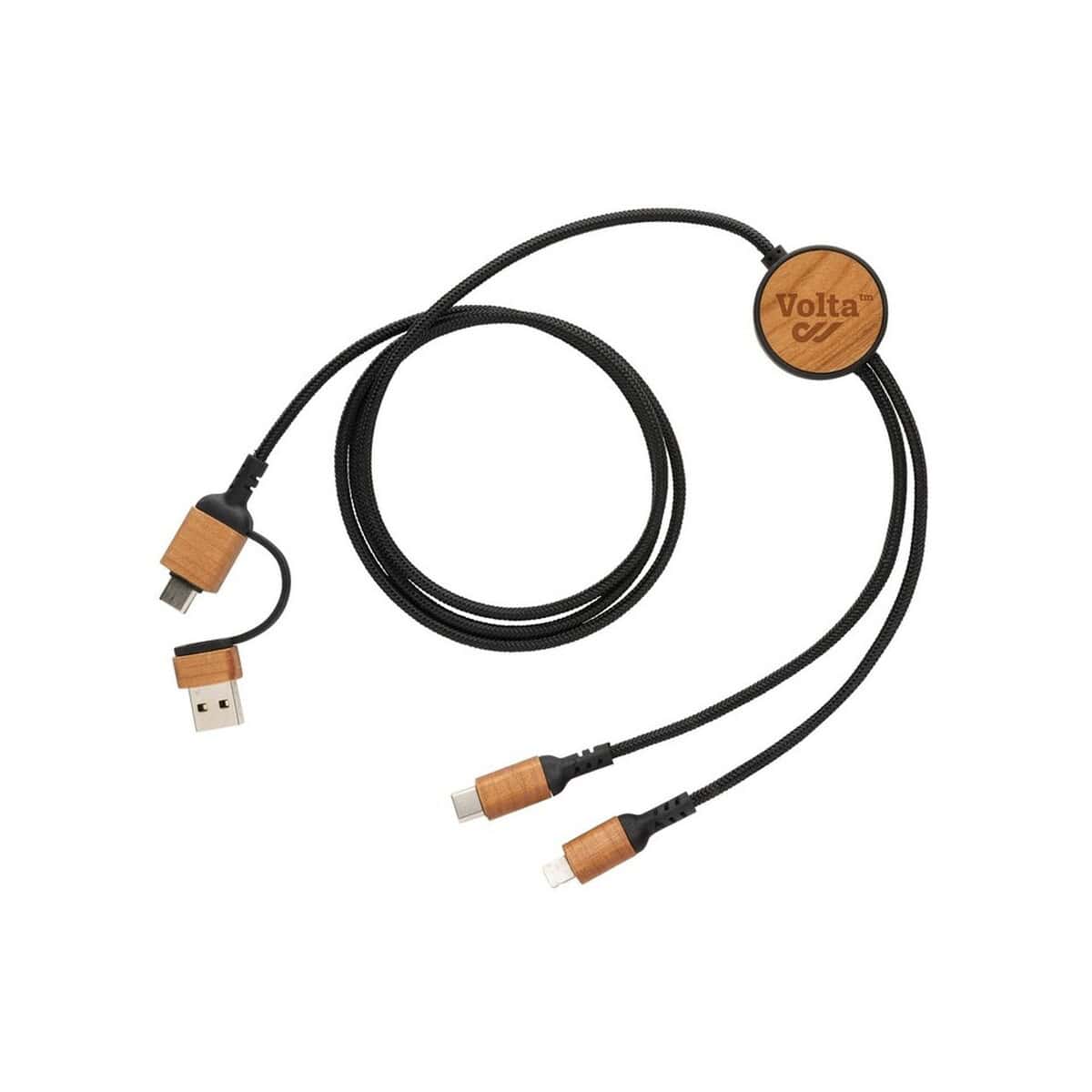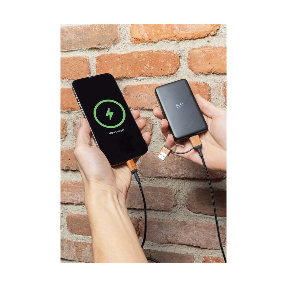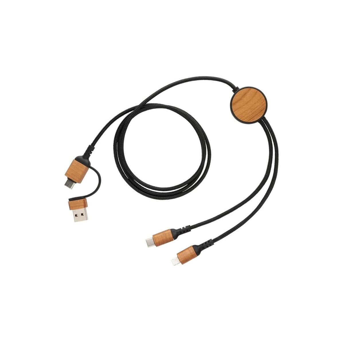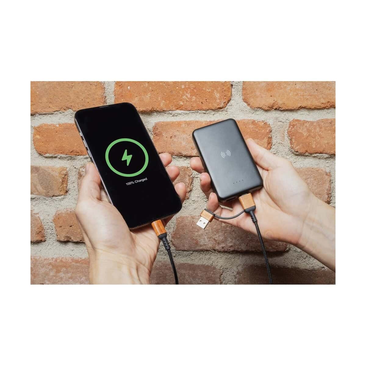 Funkcjonalność przewodu kryje się w aż 4 końcówkach: USB, 2× USB-C, micro USB/iOS 2 w 1, co umożliwia ładowanie i synchronizację niemal wszystkich najpopularniejszych urządzeń. Długość 120 cm zapewnia wygodę zarówno przy pracy przy biurku, jak i w podróży. Drewniane złącza gwarantują przyjemny, naturalny dotyk, a ślad węglowy 0,19 kg CO₂ pozwala z dumą komunikować zrównoważone podejście firmy. Całość trafia do odbiorcy w minimalistycznym opakowaniu z papieru kraftowego z certyfikatem FSC®, gotowym pod dalszy personalizowany nadruk.