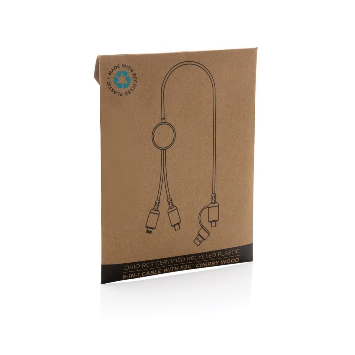 Kabel do ładowania 6 w 1 Ohio, plastik z recyklingu to nowoczesny, wielofunkcyjny gadżet, który łączy technologiczną wszechstronność z dbałością o środowisko 🙂. Jego elegancka, czarna kolorystyka w połączeniu z drewnem wiśniowym z certyfikatem FSC® sprawia, że będzie ozdobą każdego biurka lub plecaka. Solidnie wykonane przewody z TPE i poliestru pochodzącego z recyklingu oraz 46% materiałów z recyklingu w całkowitej masie podkreślają ekologiczny charakter produktu. Dzięki temu stanowi on doskonałą wizytówkę odpowiedzialnej marki, na której logo i nadruk zaprezentują się wyjątkowo efektownie.